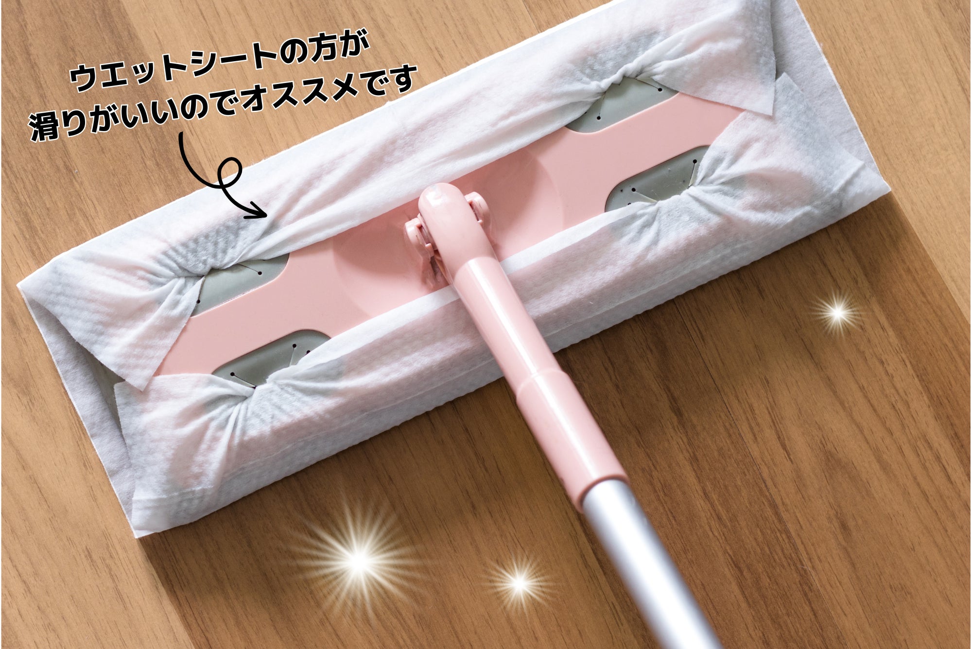 床掃除とワックスがけが同時にできる!「楽ちんやー!」のお掃除ワックスクリーナー。いつものワイパー(ウエットタイプ)にTOMIEをつけるだけ!油でベトつくキッチンもすっきりキレイになります。