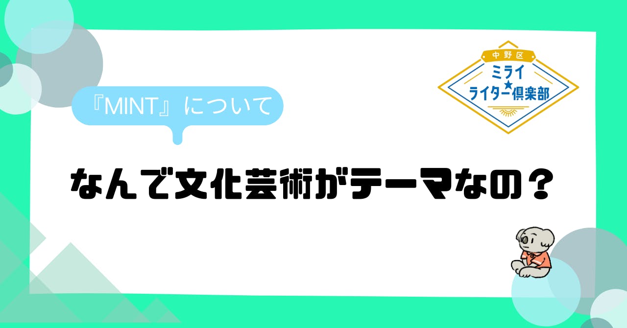 前回は、中野区の助成事業の一貫でもあったため「文化、芸術、教育を促進するもの」であることは必須でした。そのため『MINT』のテーマも必然的に「文化・芸術」になったという経緯があります。