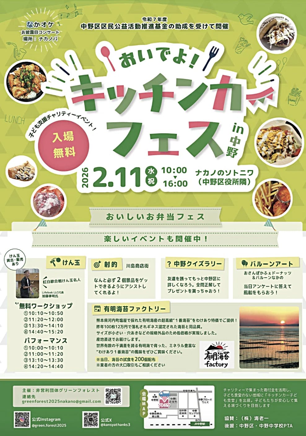 もちろん6台のキッチンカーは一般メニューも充実!!また、けん玉ワークショップ、射的、バルーンアート、クイズラリー、訳あり高級有明海苔販売など楽しいブースもたくさん!!