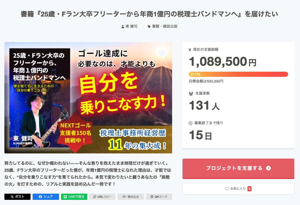 書籍『25歳・Fラン大卒フリーターから年商1億円の税理士バンドマンへ』を届けたい