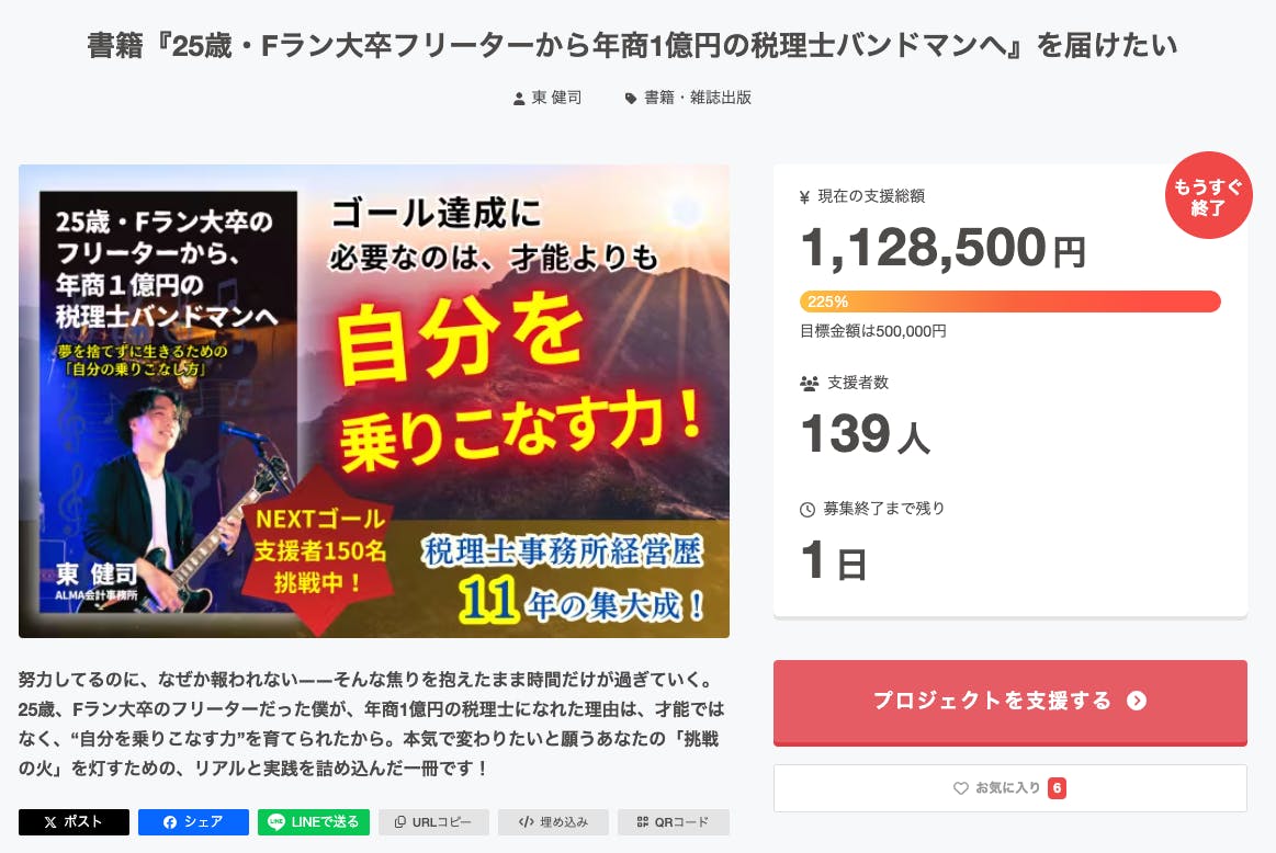 残り1日! この書籍、この挑戦を届け切るために、「こんなプロジェクトをしている税理士バンドマンがいるよ!」と最後の応援、ご紹介をいただけると嬉しいです!