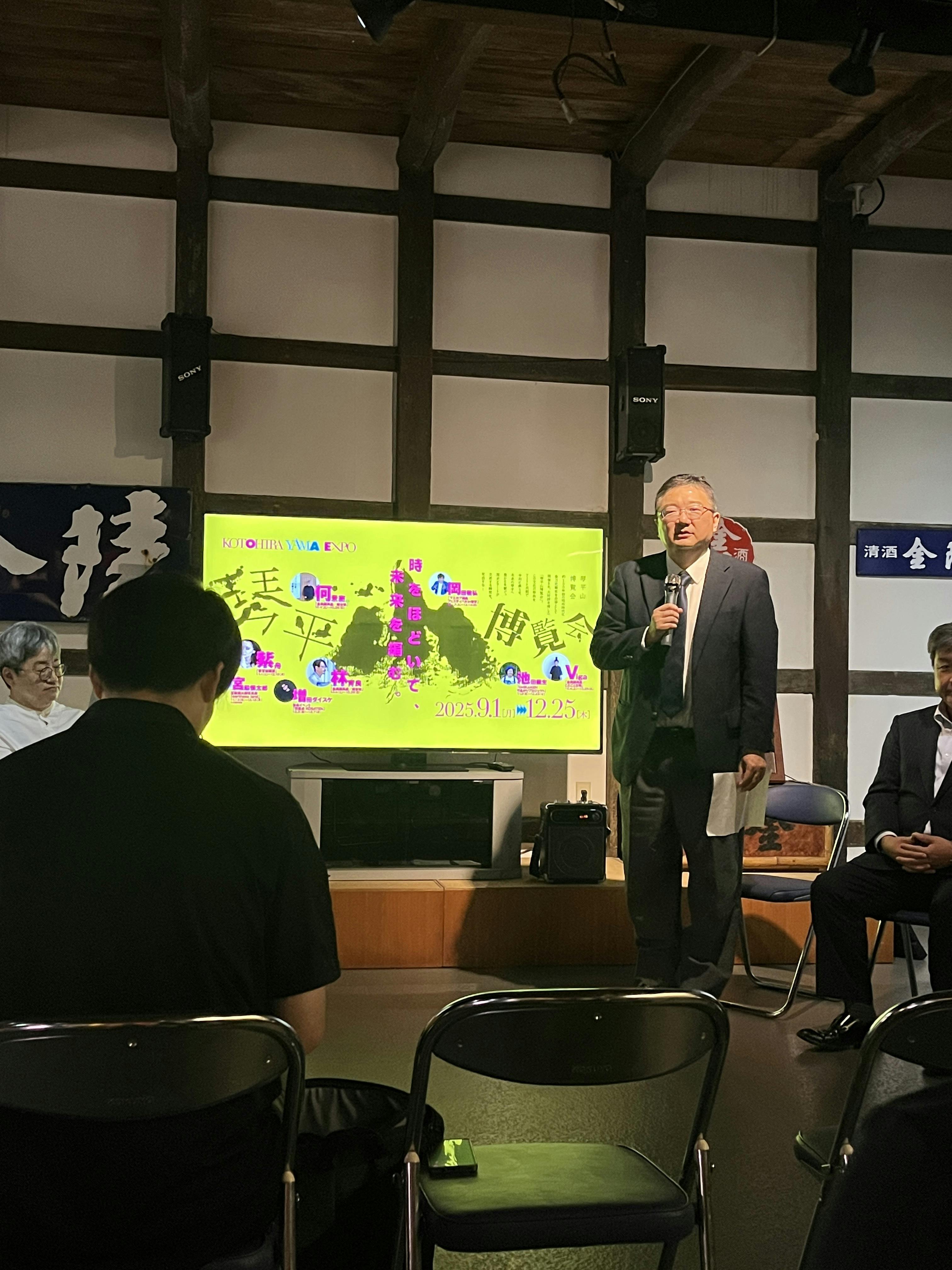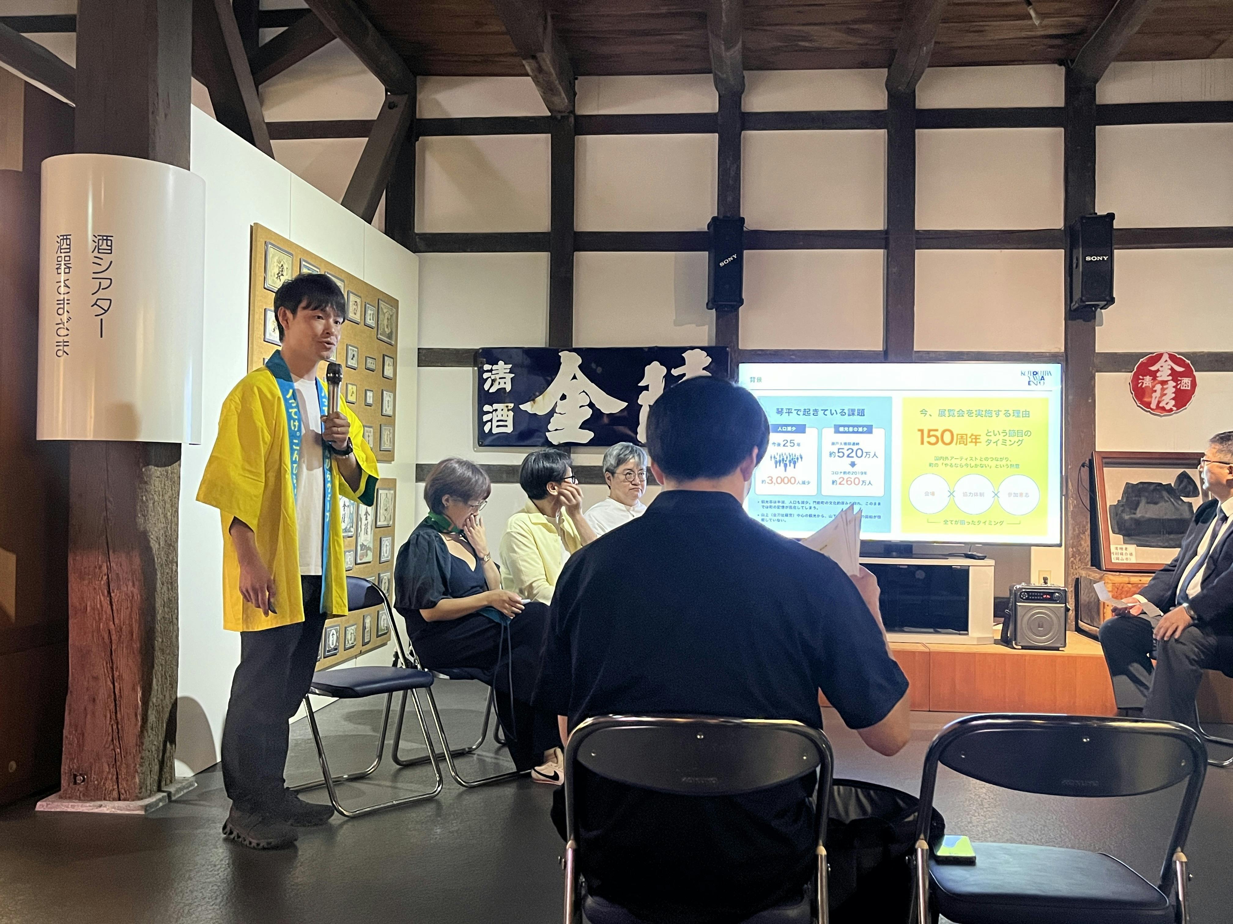 五人百姓池商店の池さんからご挨拶開会の挨拶に続いて琴平山博覧会の概要をあらためてご紹介した後には、片岡町長、氏家商工会長、渡辺町議会議長ら来賓の皆様からお祝いの言葉を頂戴し、アーティストたちの今回の展示作品や琴平町への想いを語っていただきました。
