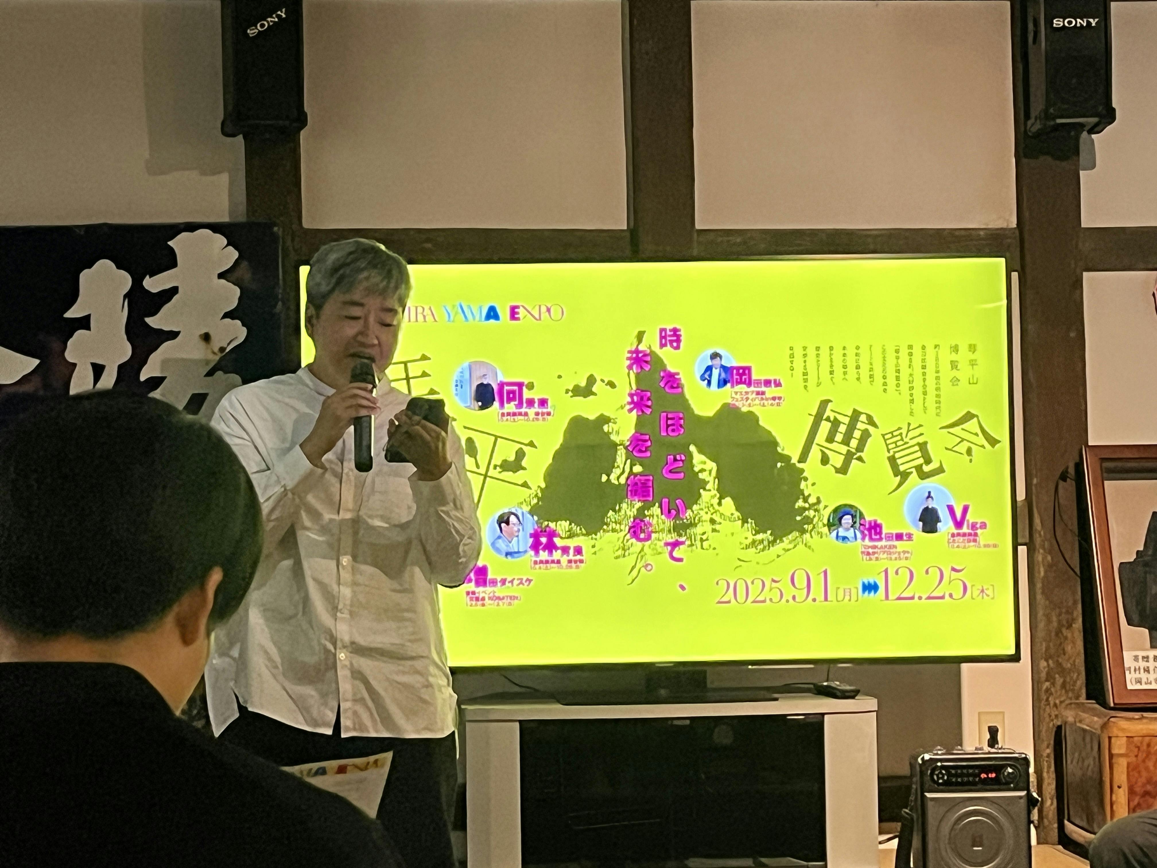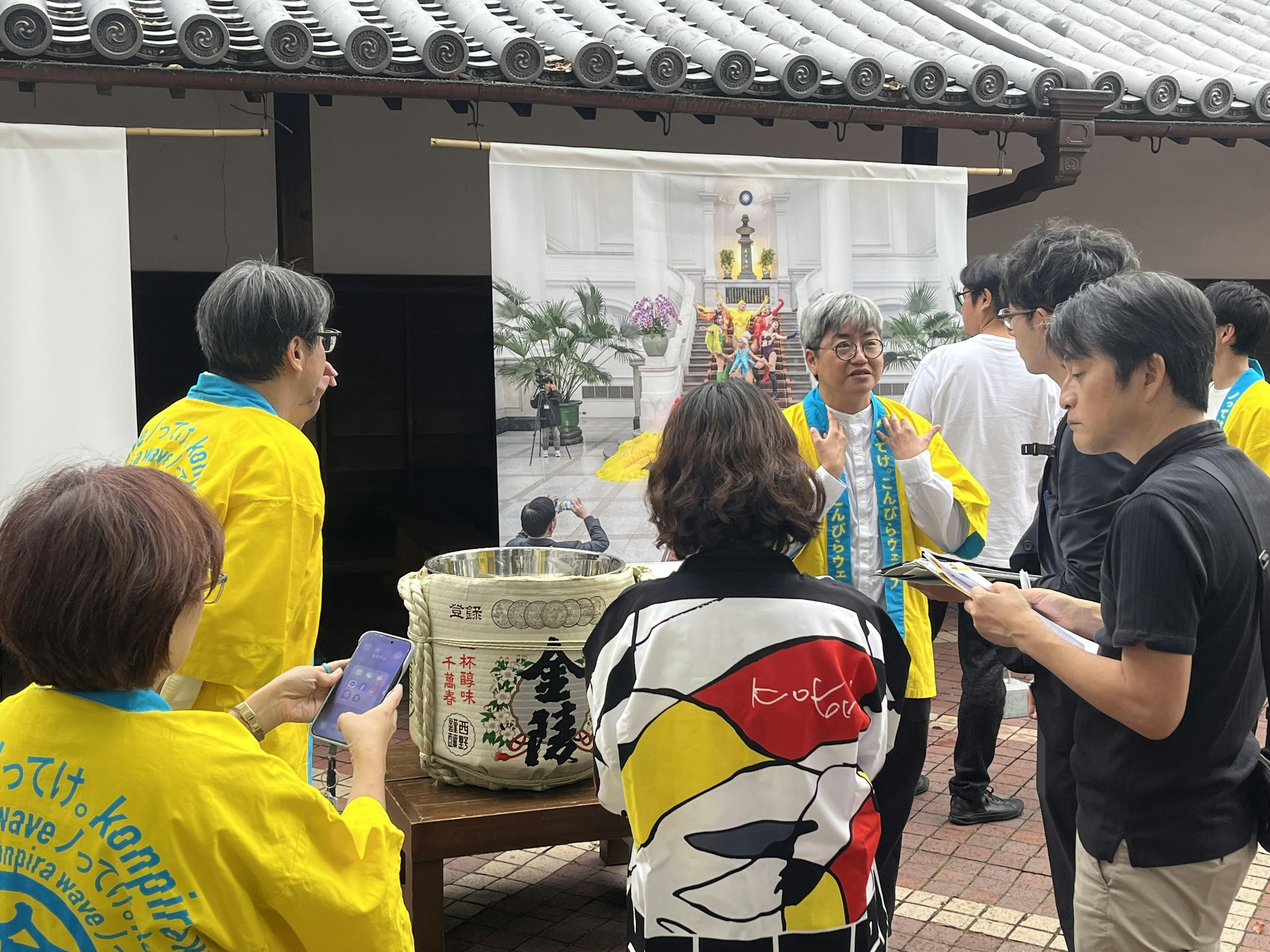 町全体を使った展示について話す林育良(マコト・リン)さん最後はみんなで鏡開き