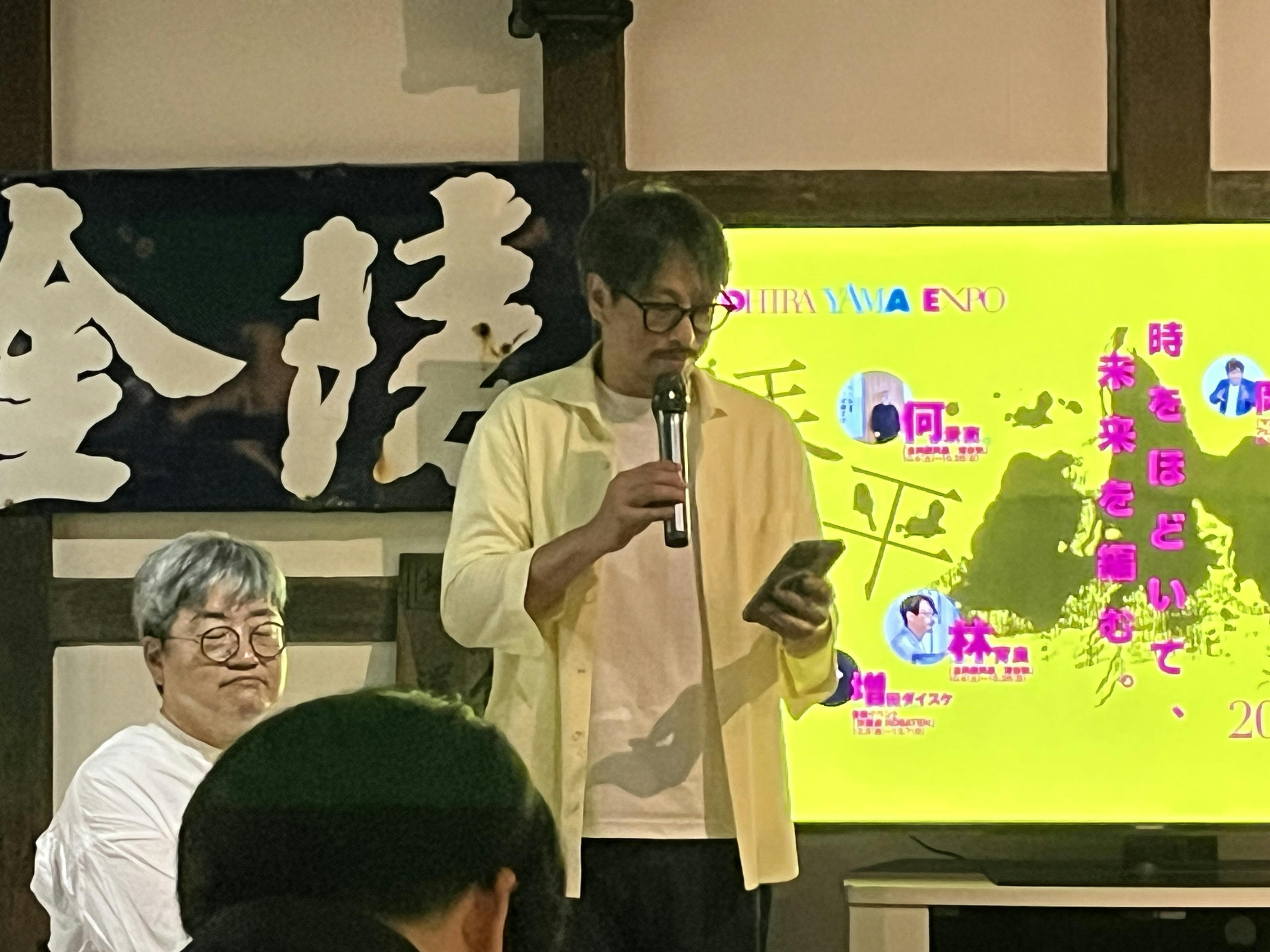 林育良(マコト・リン)さんとViga(ヴィガ)さんの展示の主会場となる金陵の郷で、台湾からはマコトさんと何景窗(ホー・チンチュアン)さん、キュレーターの小令(シャオリン)さんに登壇いただきました。