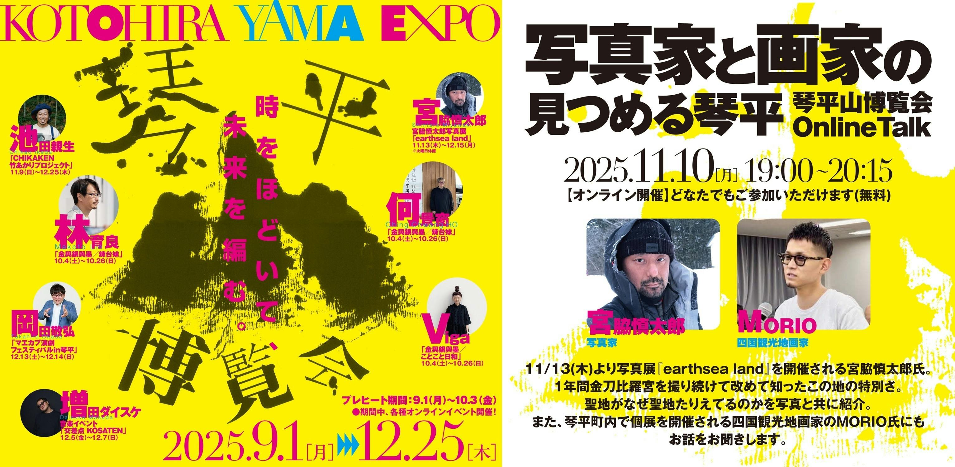 \オンライン開催/写真家と画家の見つめる琴平【琴平山博覧会 Online Talk】2025年11月10日(月)19:00〜20:15 オンライン開催(無料・どなたでもご参加いただけます)YouTube[琴平デジタル町民チャンネル]でライブ配信します!https://www.youtube.com/live/sixgYMk6N98 【イベント概要】11/13(木)より写真展『earthsea land』を開催される宮脇慎太郎氏。1年間金刀比羅宮を撮り続けて改めて知ったこの地の特別さ。聖地がなぜ聖地たりえてるのかを写真と共に紹介。また、琴平町内で個展を開催される四国観光地画家のMORIO氏にもお話をお聞きします。 【出演者】宮脇慎太郎/写真家 https://www.shintaromiyawaki.com/ https://www.instagram.com/solow_miyashin/ MORIO/四国観光地画家https://www.instagram.com/moriotourism/ 【司会】楠木泰二朗/琴平バス株式会社(コトバス)代表取締役https://www.instagram.com/kusunokitaijiro/ どんなお話が聞けるのか、どうぞお楽しみに♪琴平山博覧会 公式ホームページhttps://www.kotohira.art/クラウドファンディング実施中!まだまだご支援と拡散をぜひお願いします!https://camp-fire.jp/projects/863742/