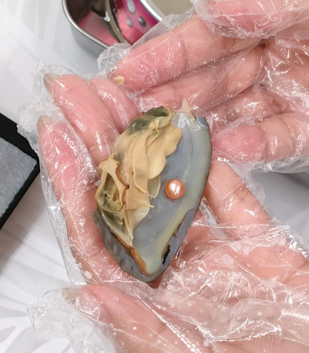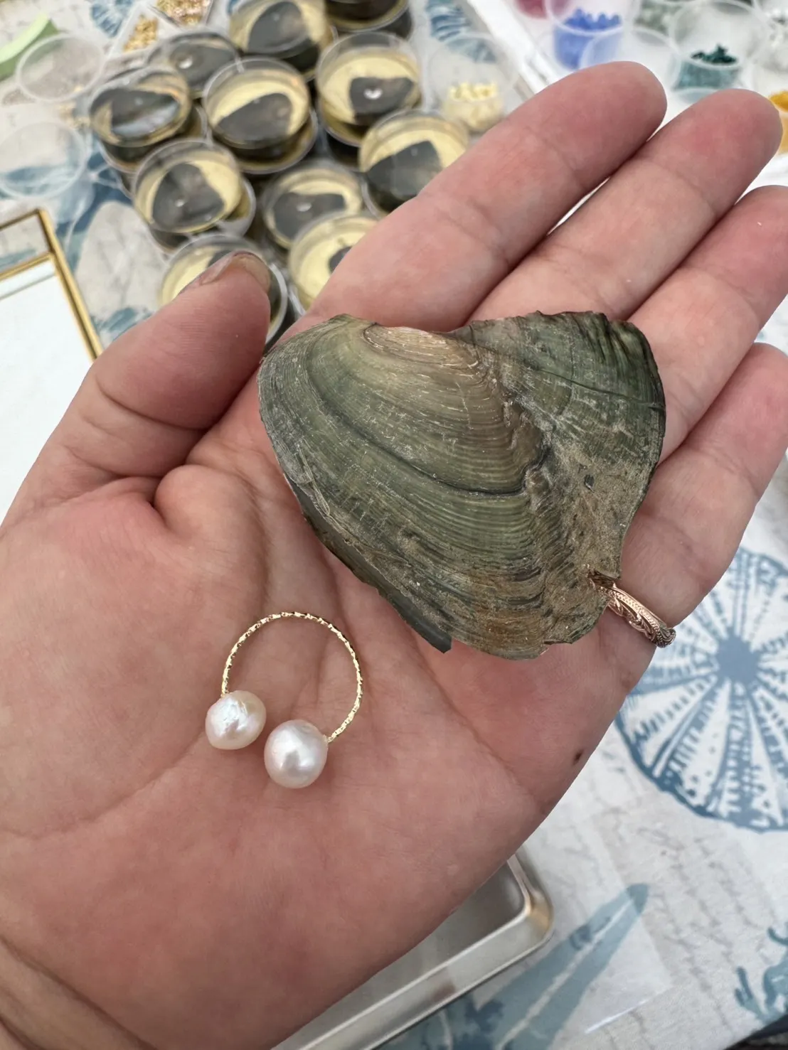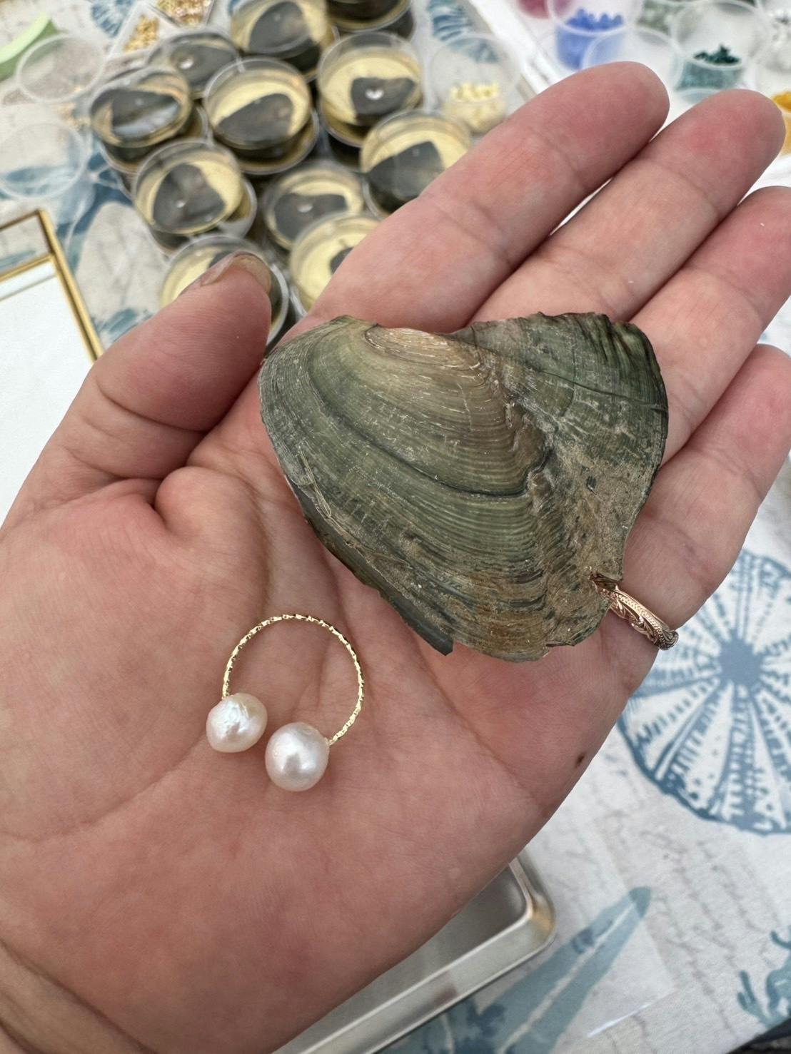 貝からパールを取りだしオリジナルのアクセサリーを作成。