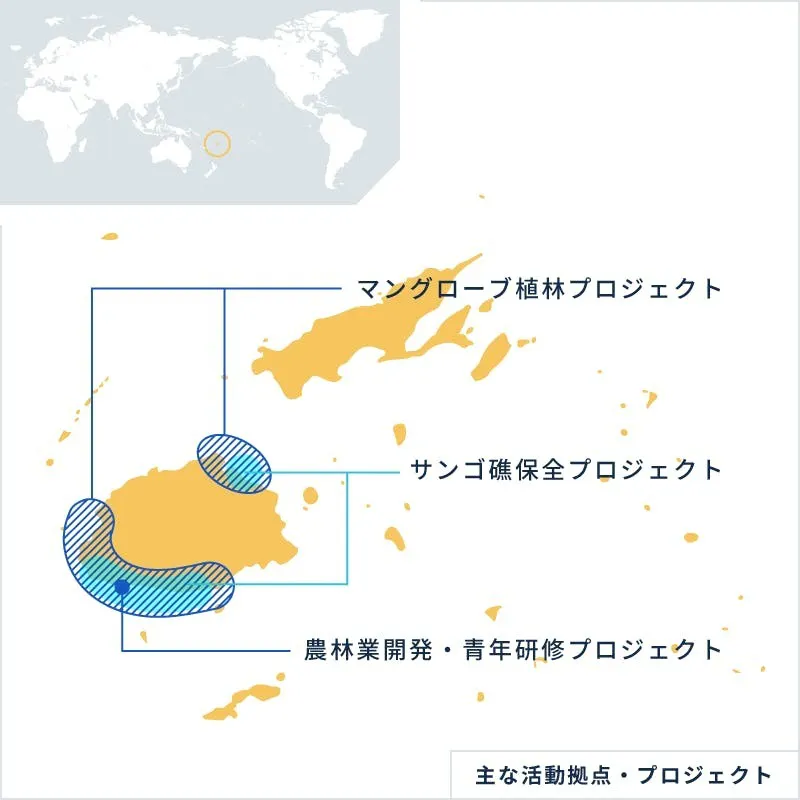 ヴィチレブ島を主な舞台に、住民の手で持続可能な地域を作っていくための農業研修のほか、「子供の森」計画、そして同島沿岸部ではマングローブ植林を実施しています。