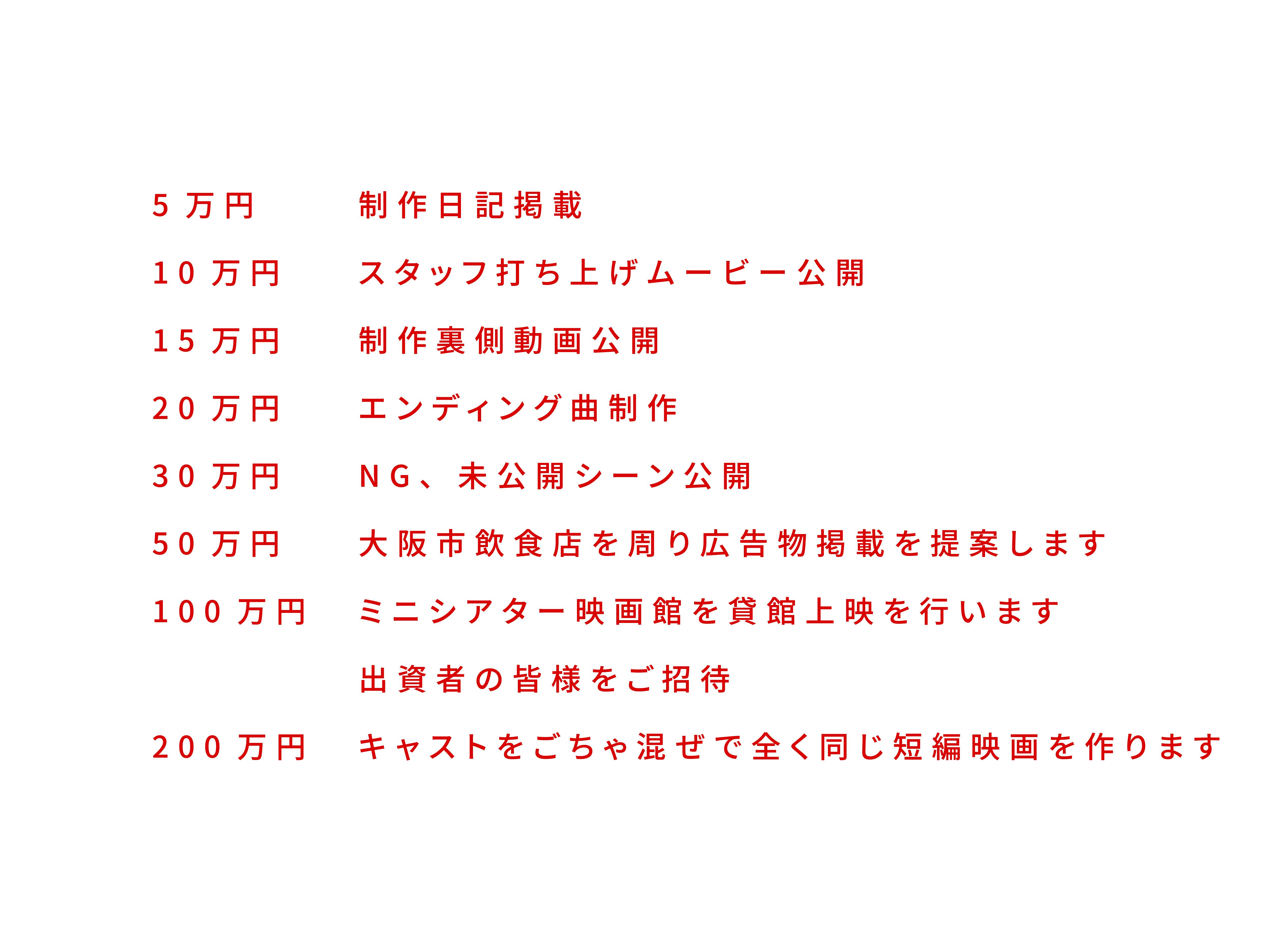 皆様の支援ごとに企画を準備し、Final Goalでは上演会を実施し金額に関わらず支援者皆様をご招待する企画を行います。