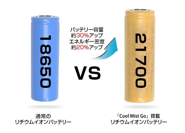 「Cool Mist Go」は、内蔵バッテリーに21700充電池を採用しています。一般的なポータブルデバイスに使われている18650電池より、エネルギー密度が約20%アップされ、連続利用時間が長くなります。出力も大きく、サイクル寿命も長いのが特長です。