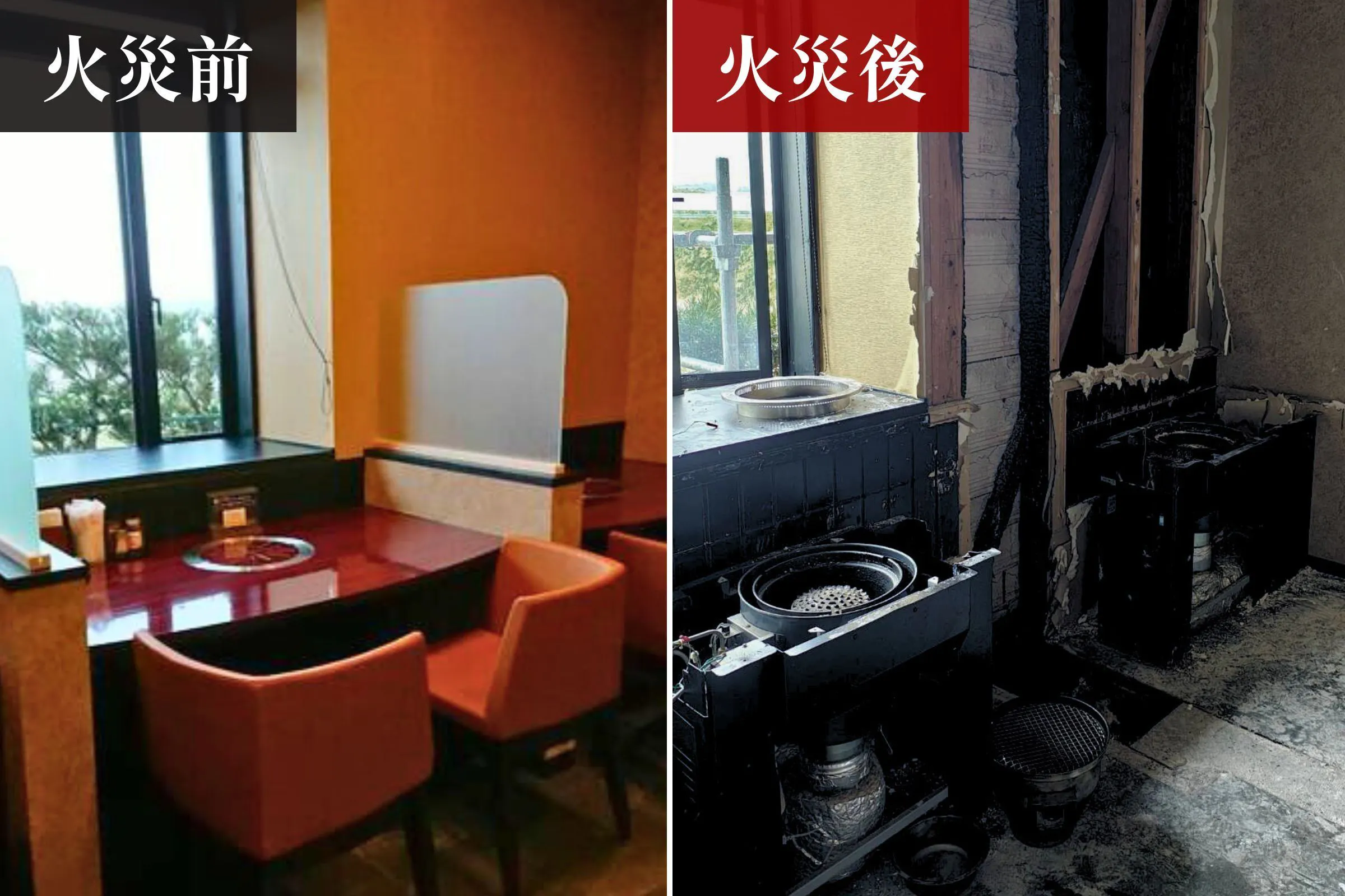 お客様のテーブルのロースターから火が引火し、ダクトへ一瞬にして炎が燃え上がり、店内は煙に包まれました。