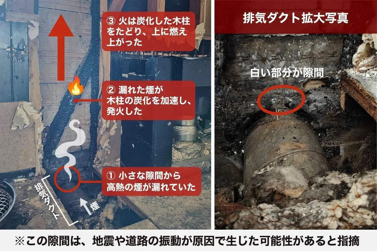 火災の出火原因は、排気ダクトと壁の間にできた隙間から高温の煙が漏れたことが原因で、木柱が炭化し発火しました。現場検証では、この隙間は地震や道路の振動などによって生じた可能性を指摘されています。