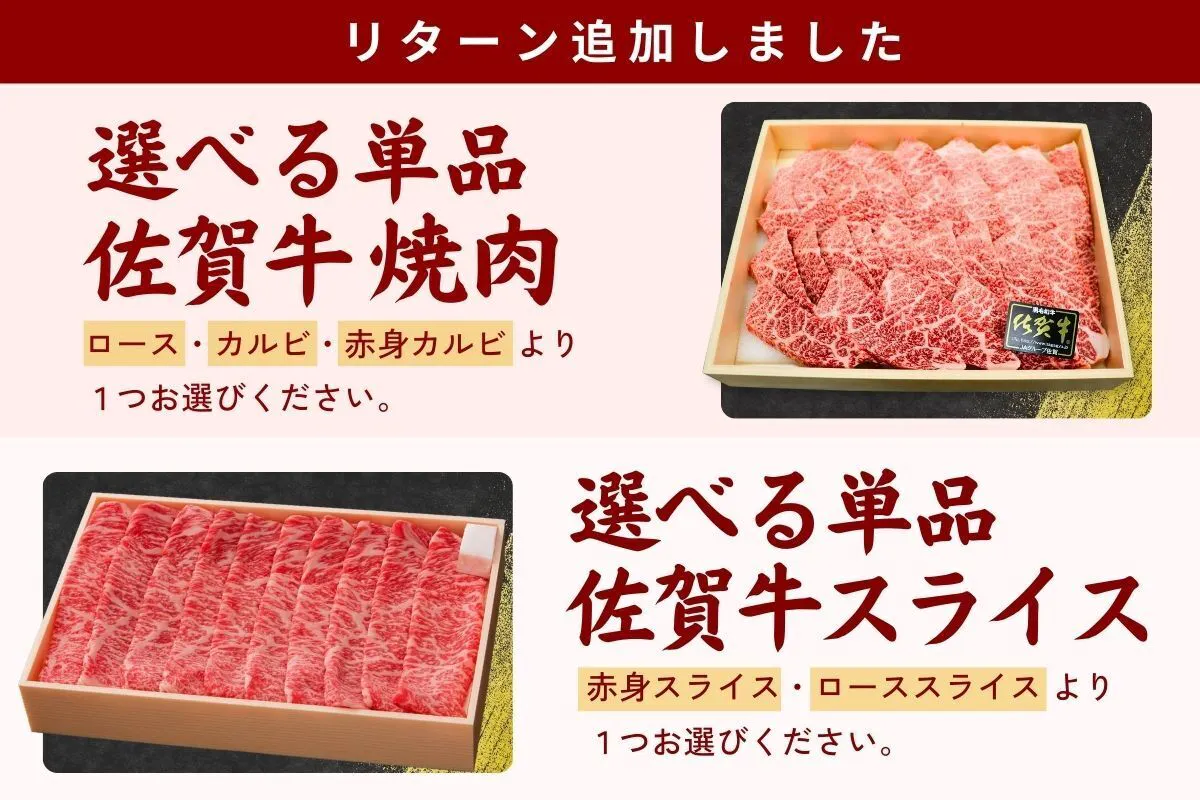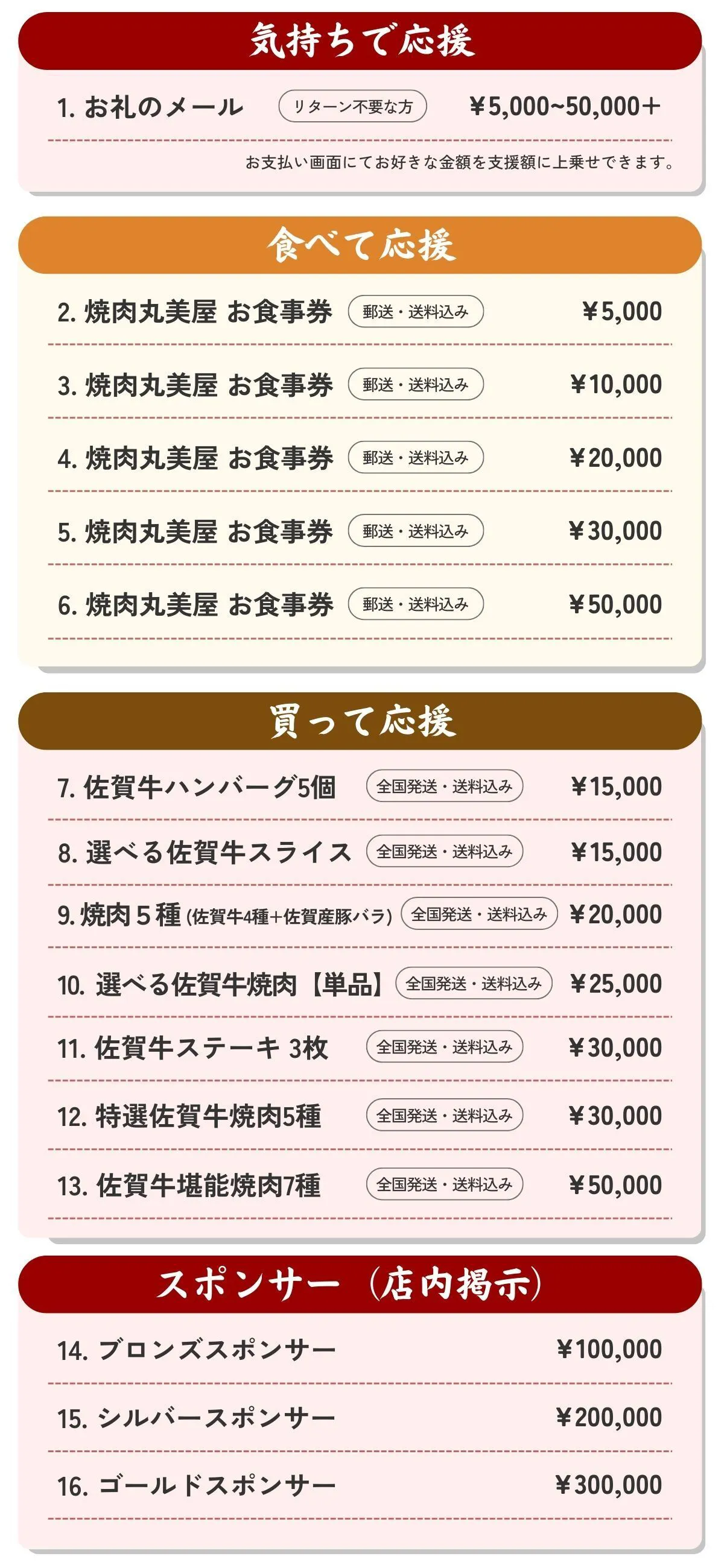 A4・A5ランクの佐賀牛焼肉セットや店舗再建後にご来店いただけるお食事券など、ささやかではありますが、心を込めてお届けいたします。(配送するお肉は佐賀丸美屋の精肉店よりお送りいたします。)