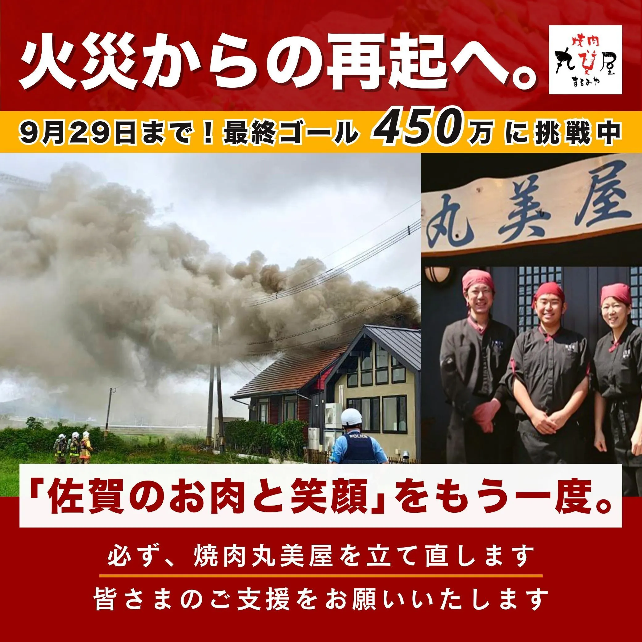 2025年6月の火災で営業を休止した「焼肉丸美屋」の再建に、どうか皆さまのご支援をお願いいたします。