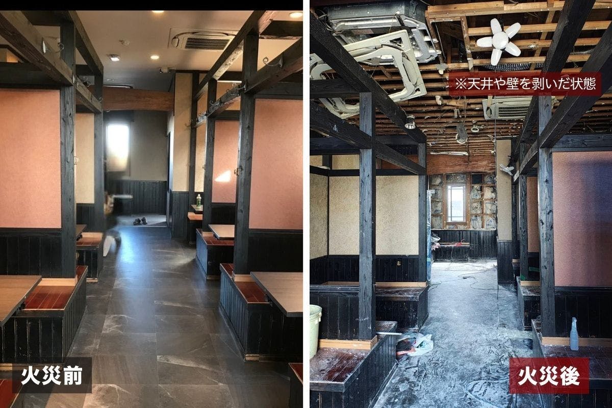 なんとか燃え残った1階部分ですが消火で大量の水を浴び、天井だけでなく床やダクトにも大きなダメージを受けていた事がわかりました。