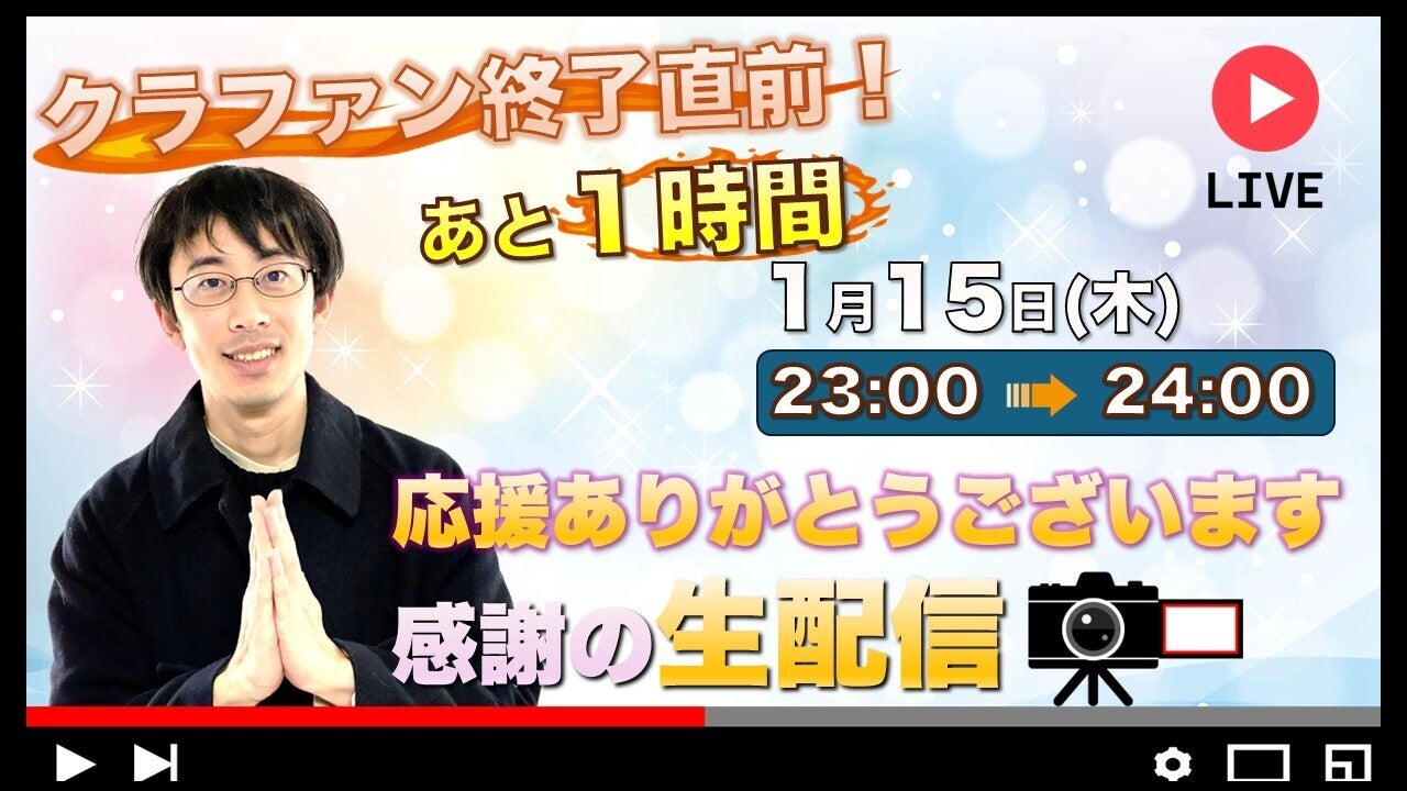 ご支援者の皆さまへいつも温かいご支援、応援を本当にありがとうございます。クラウドファンディングも、いよいよ本日が最終日となりました。ここまでたくさんの方にご支援いただき、心から感謝しております。本日は、23時から終了まで(24時)生配信を予定しております。これまで応援してくださった皆さまに、感謝の気持ちをお伝えする時間になればと思っています。配信はこちら:https://youtube.com/live/7BitFzatSWk?feature=share