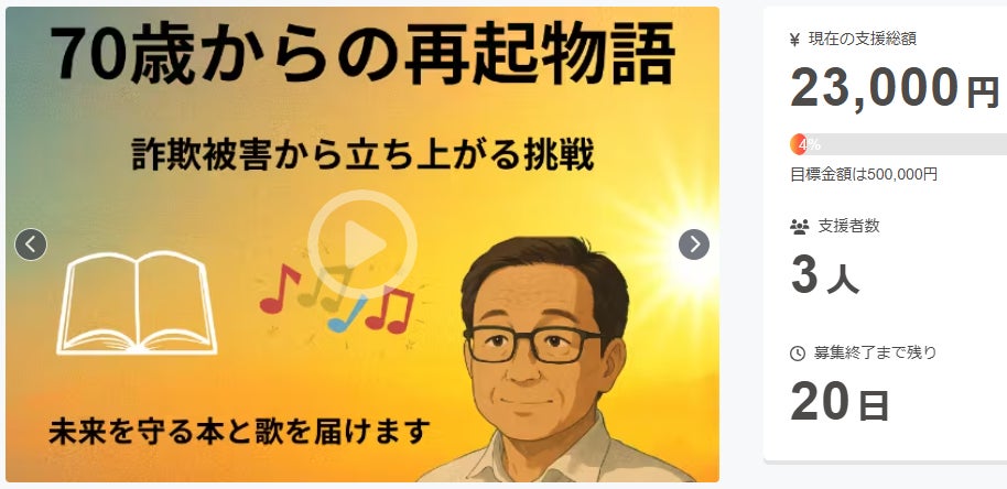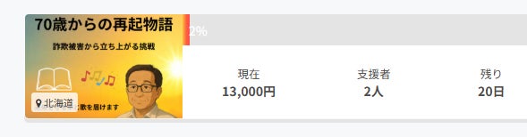 クラウドファンディングをスタートして、さっそく最初のご支援をいただきました!しかも支援してくださったのは、私たちの仲間の先輩です。 とても嬉しく、そして本当に心強いです。 初めての一歩を支えていただけたことに、心から感謝しています。 ありがとうございます。まだ始まったばかりですが、この挑戦を通して「70歳からの再起物語」を多くの方に届けたいと思っています。 引き続き温かく見守っていただければ嬉しいです。 ◎ 開催期間:9/12 ~ 10/3 → https://camp-fire.jp/projects/863800/view