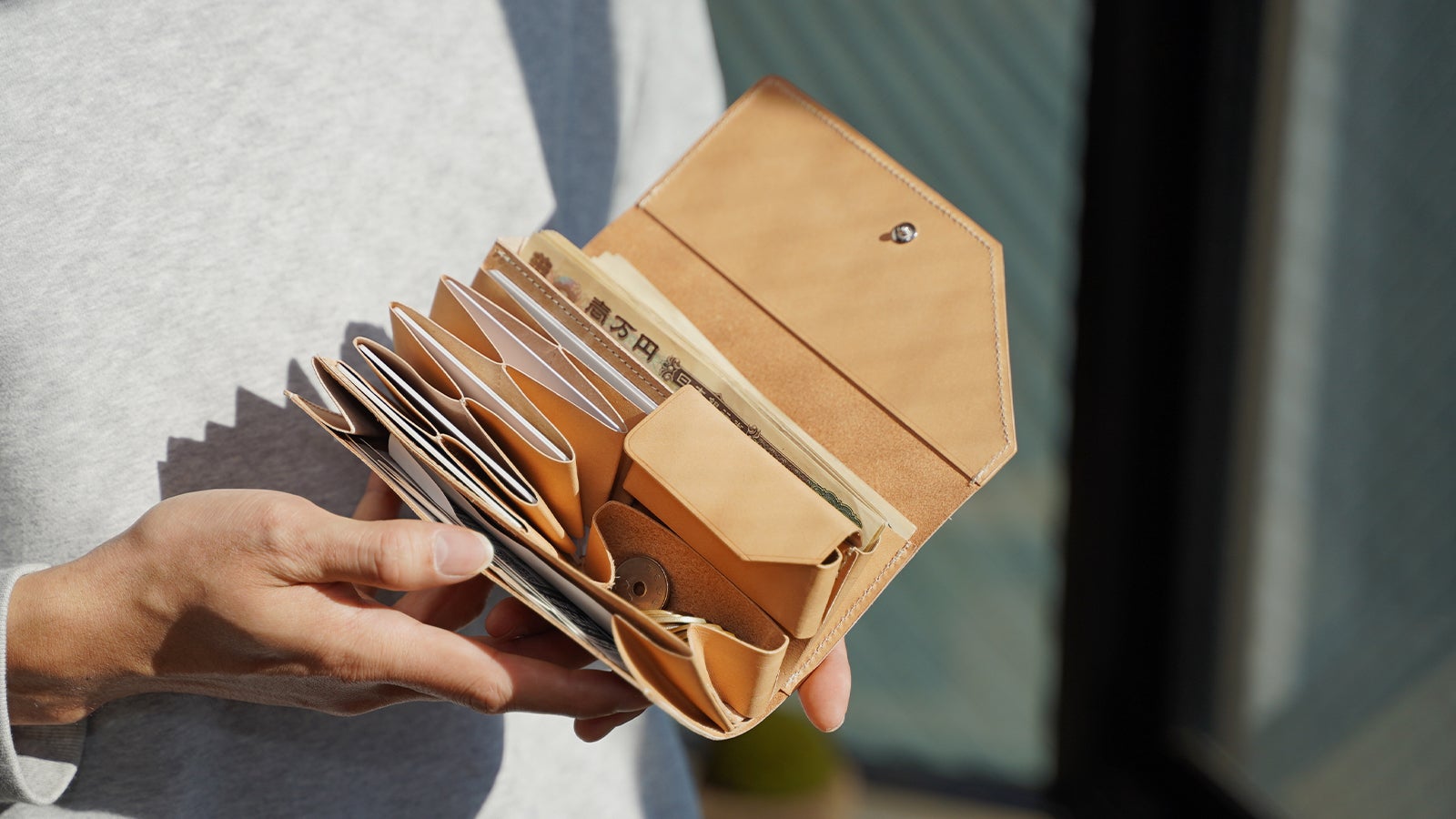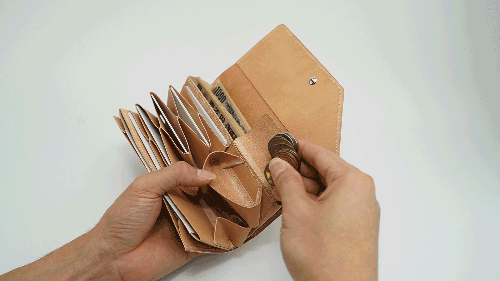 紙幣・カード・小銭も自然な動作で出し入れでき、使い心地にもゆとりがあります。