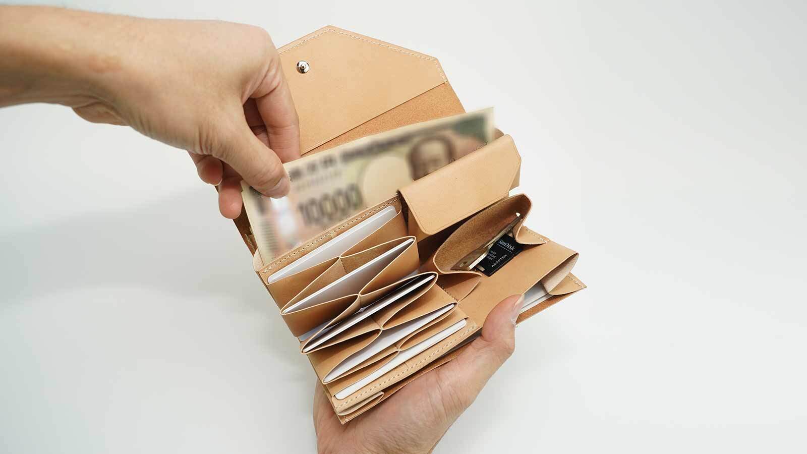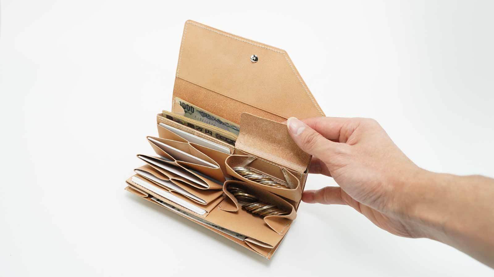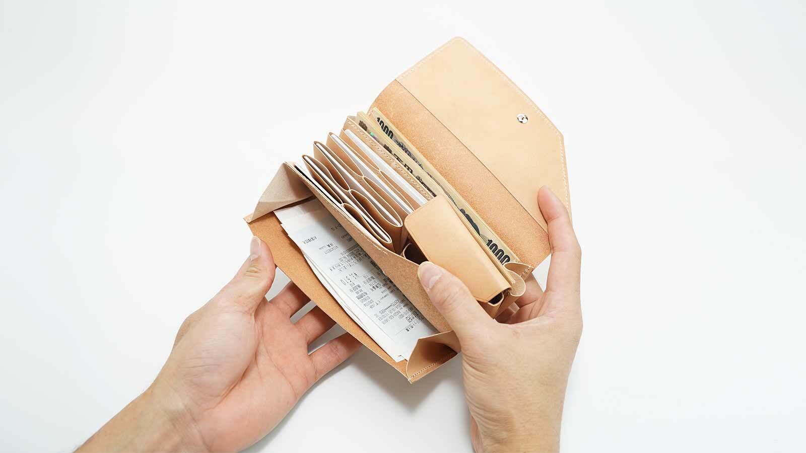 あえて紙幣が入らないサイズに設計することで、紙類と紙幣を自然に分けて整理できるようになっています。無意識のうちに中身が整うよう誘導され、常に整理整頓が可能です。
