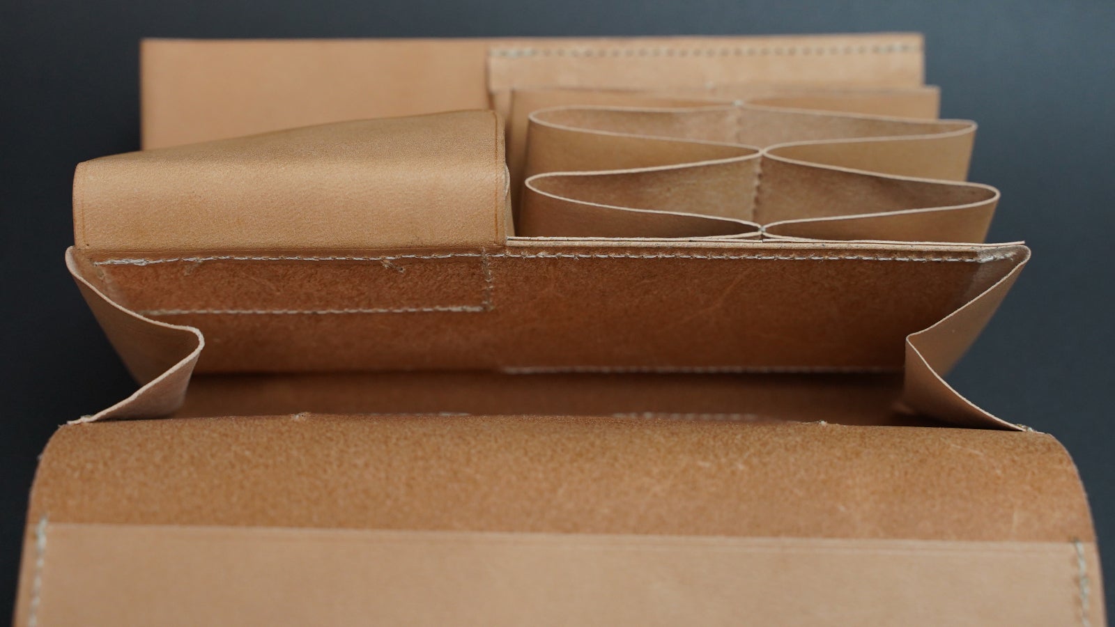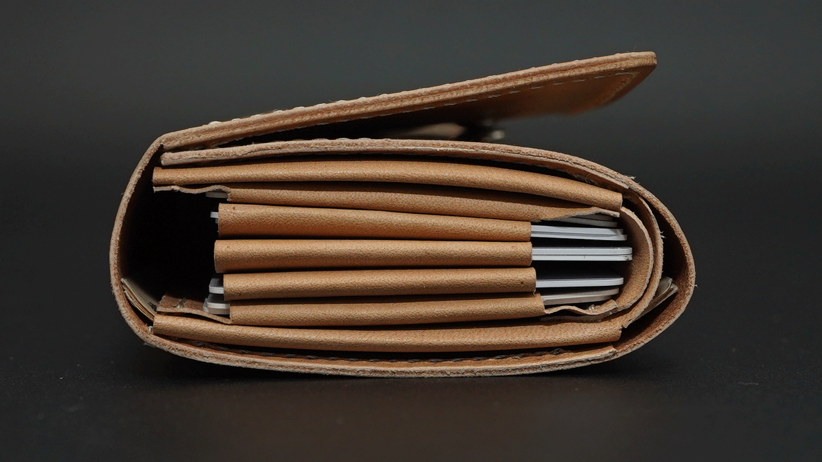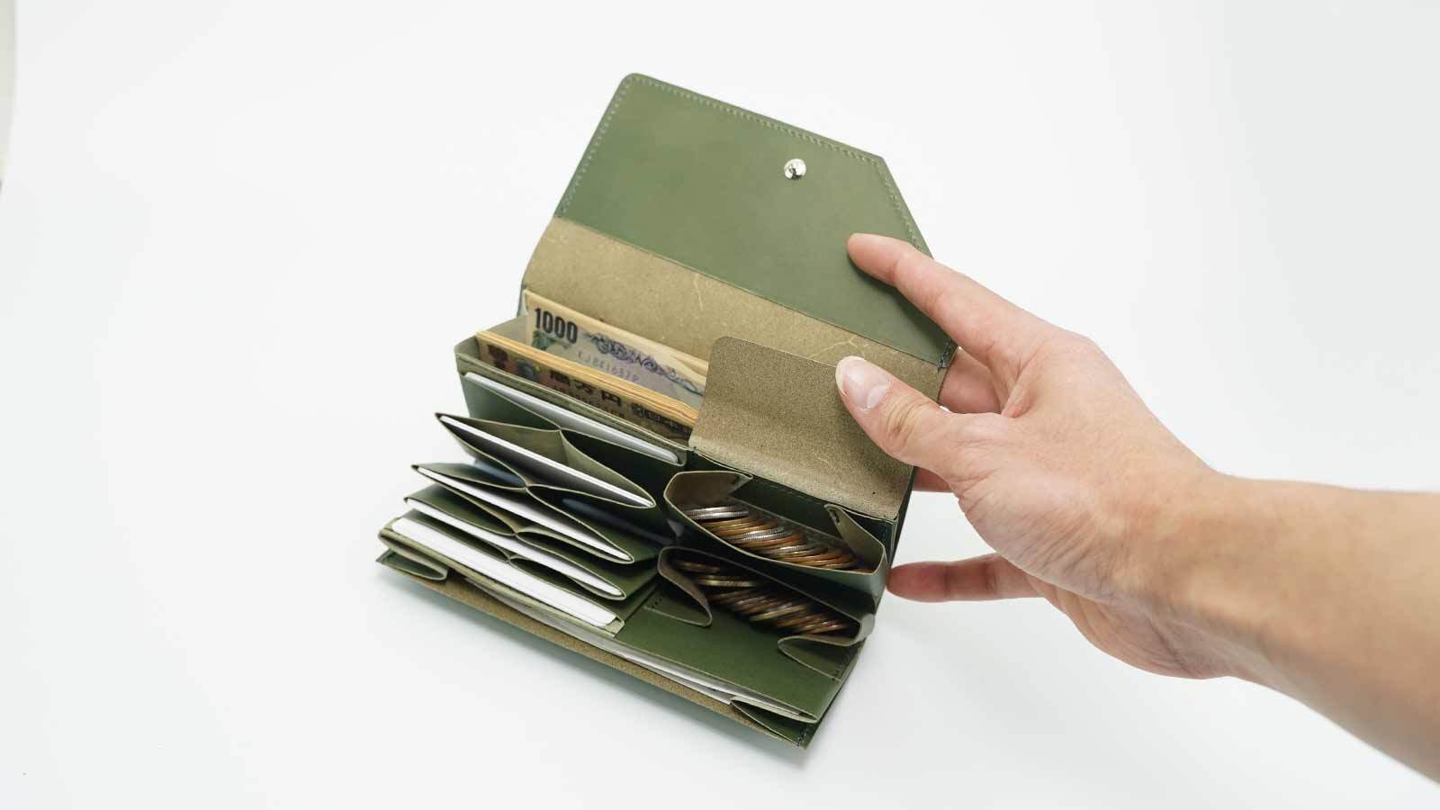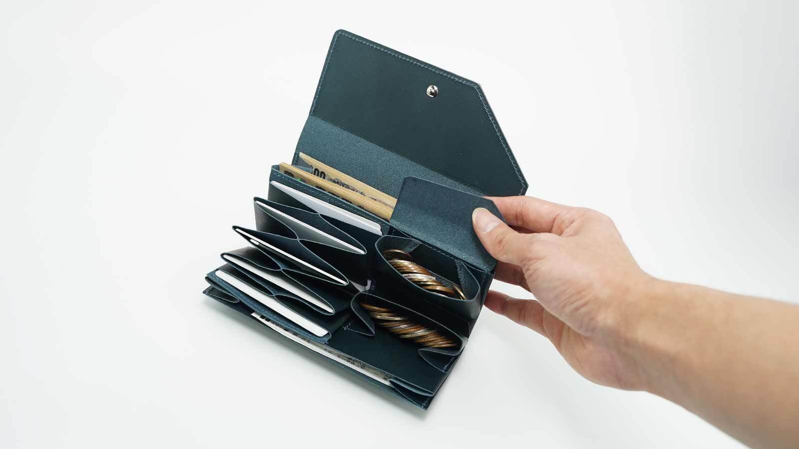 財布を開くと、カードポケットが扇のように大きく広がります。