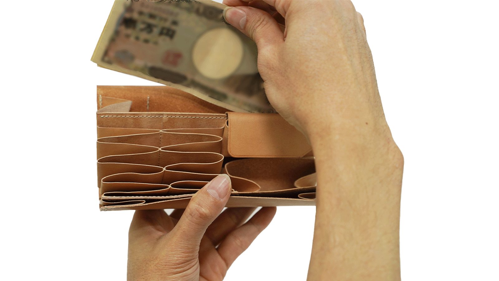 紙幣はフタ側の側面から差し込み、スライドさせることで財布の下部スペースにしっかりと収まる構造になっています。