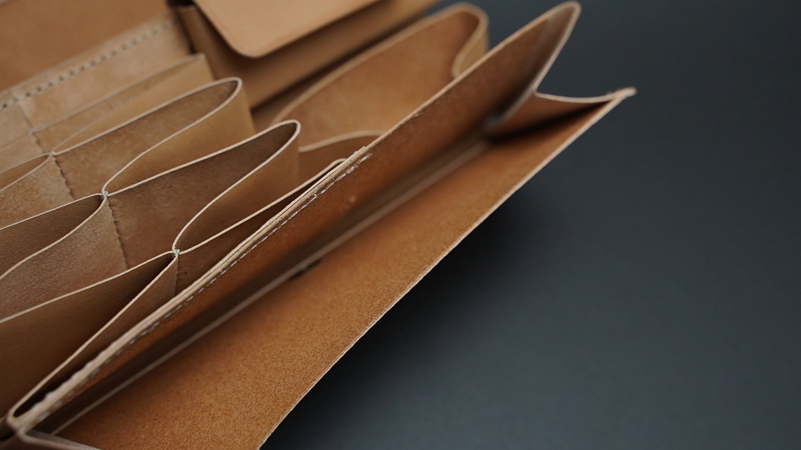 この長財布に使用している革は、ほどよい硬さとしっとりとした手触りが特徴。「セミアニリン仕上げ」と呼ばれる特別な着色技法により、控えめながらも上品な風合いが漂います。