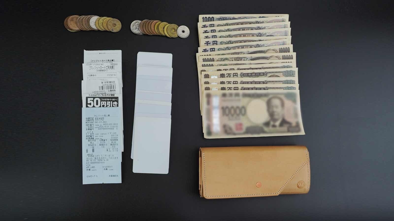 収納可能な目安は【紙幣:20枚、カード:17枚、硬貨:30枚】です。