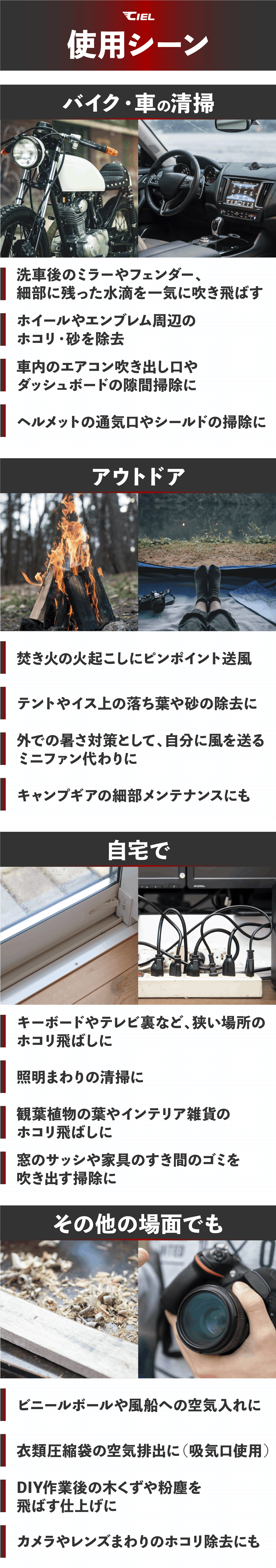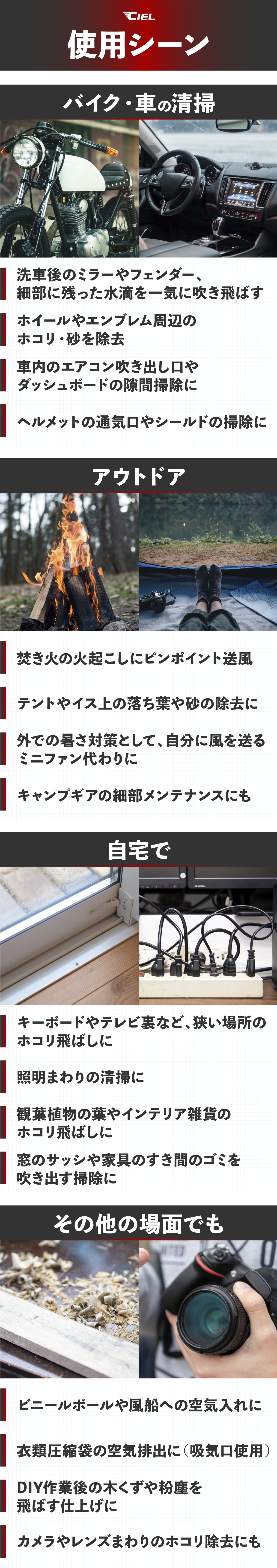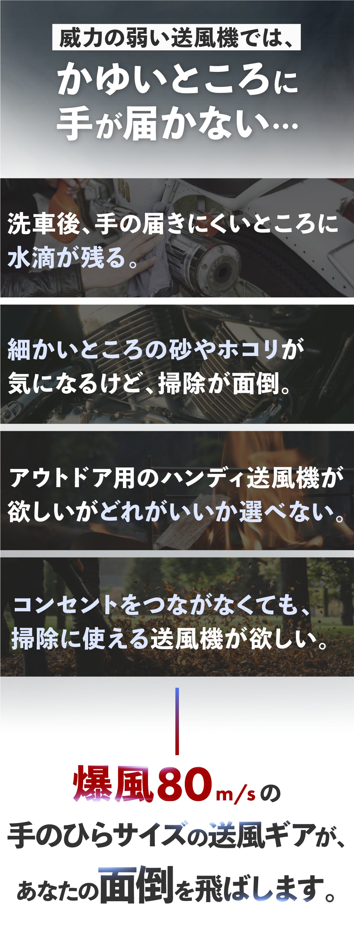 小型ながらも圧倒的な送風力で、あなたの作業を強力にサポート。清掃以外にもアウトドアやキャンプの火起こし、掃除にも使える、多用途に活躍する一台です。