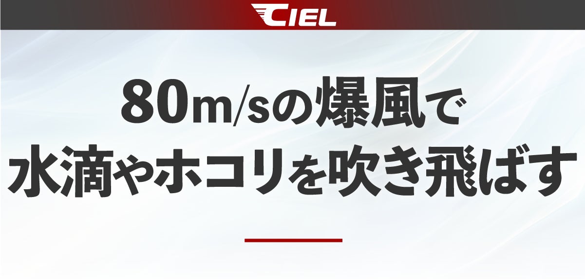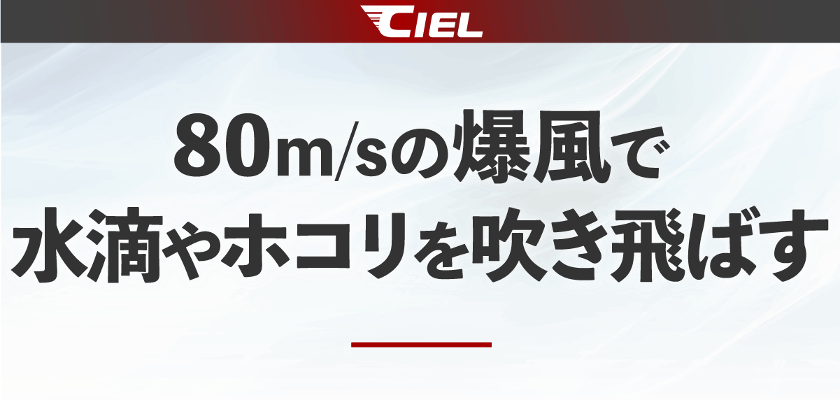 ジェット機の離陸速度にも匹敵する、最大風速80m/s(時速280㎞)の強力送風!この圧倒的なパワーにより、洗車後に車体に残った細かい水滴を素早く吹き飛ばし、拭き取りの手間を大幅に軽減します。