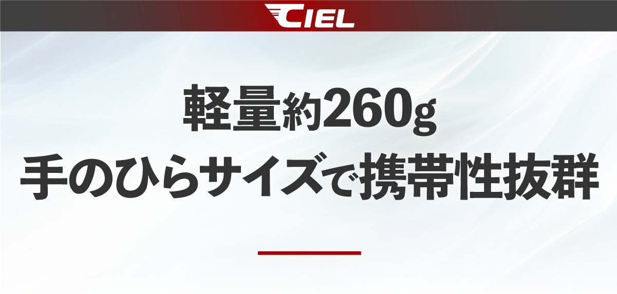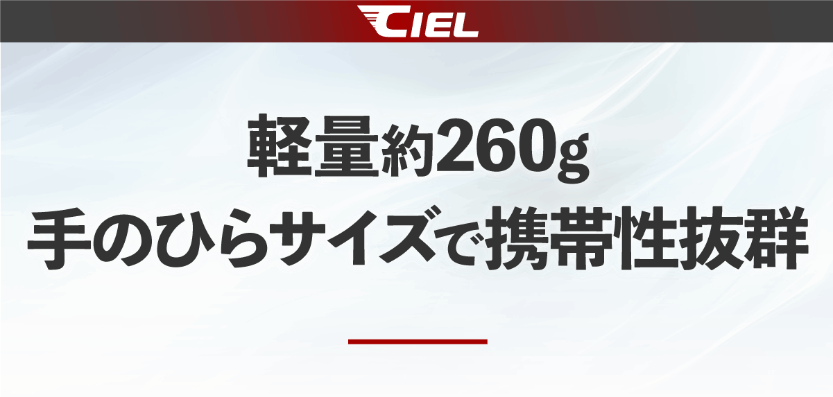 本体重量はわずか約260g。スマートフォンほどの軽さで、片手でラクに持てるコンパクトサイズです。手のひらに収まるほど小型なので、ポケットにもスッと収納可能。
