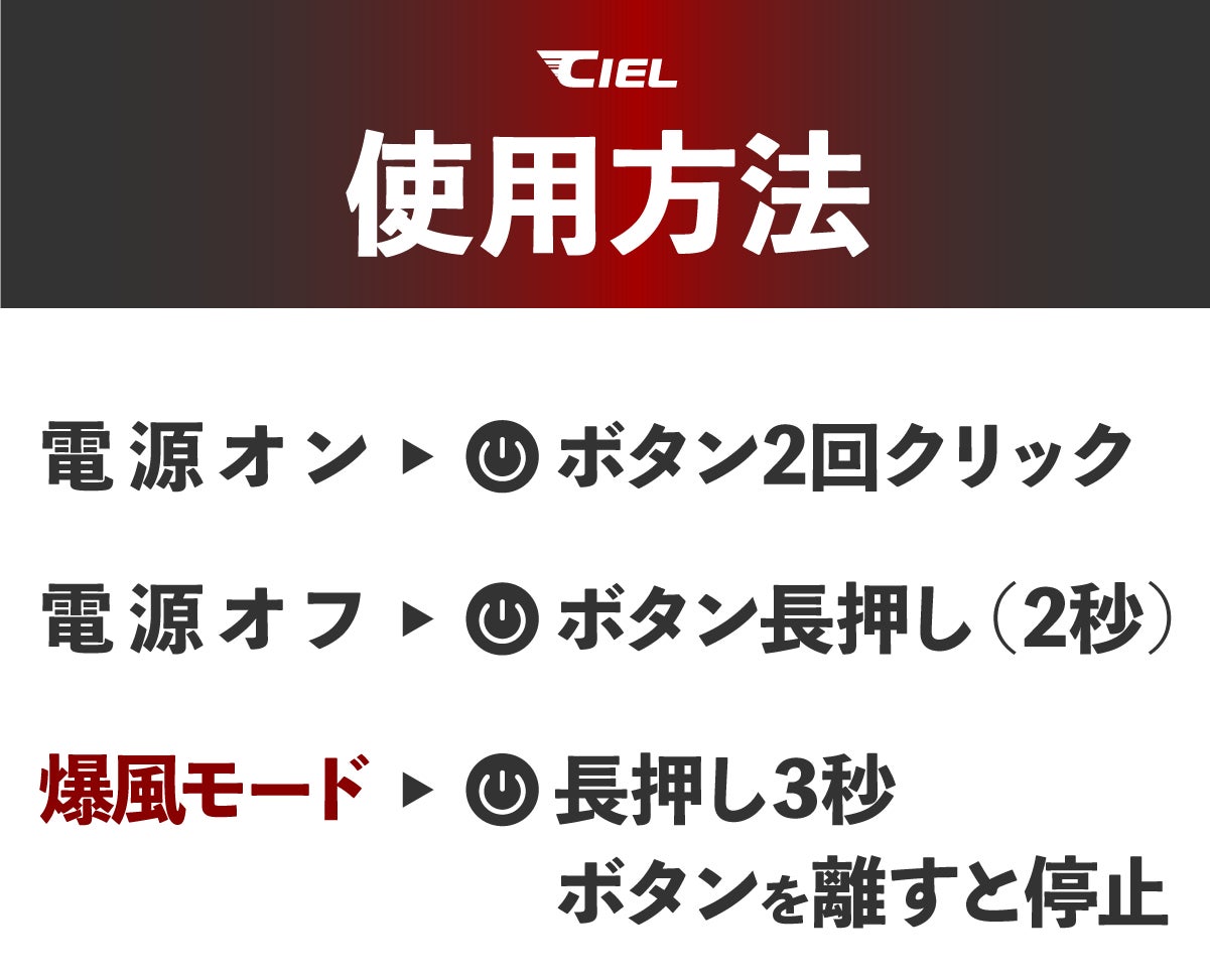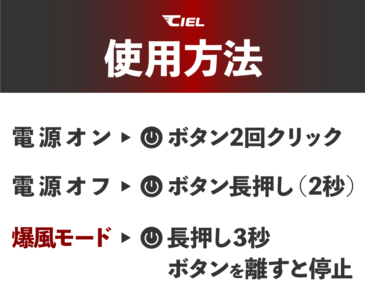 A 電源がオフの状態から、電源ボタンを約3秒押すと爆風モードになります。そのまま電源ボタンを押し続けている間は爆風モードです。電源ボタンから手を離すと、風が止まります。