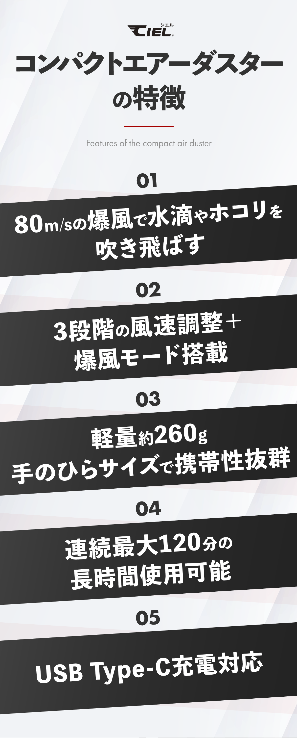 コンパクトエアーダスターは、4000mAhの大容量バッテリー。こまめな充電を気にせず、使いたいタイミングでしっかりパワーを発揮してくれます。