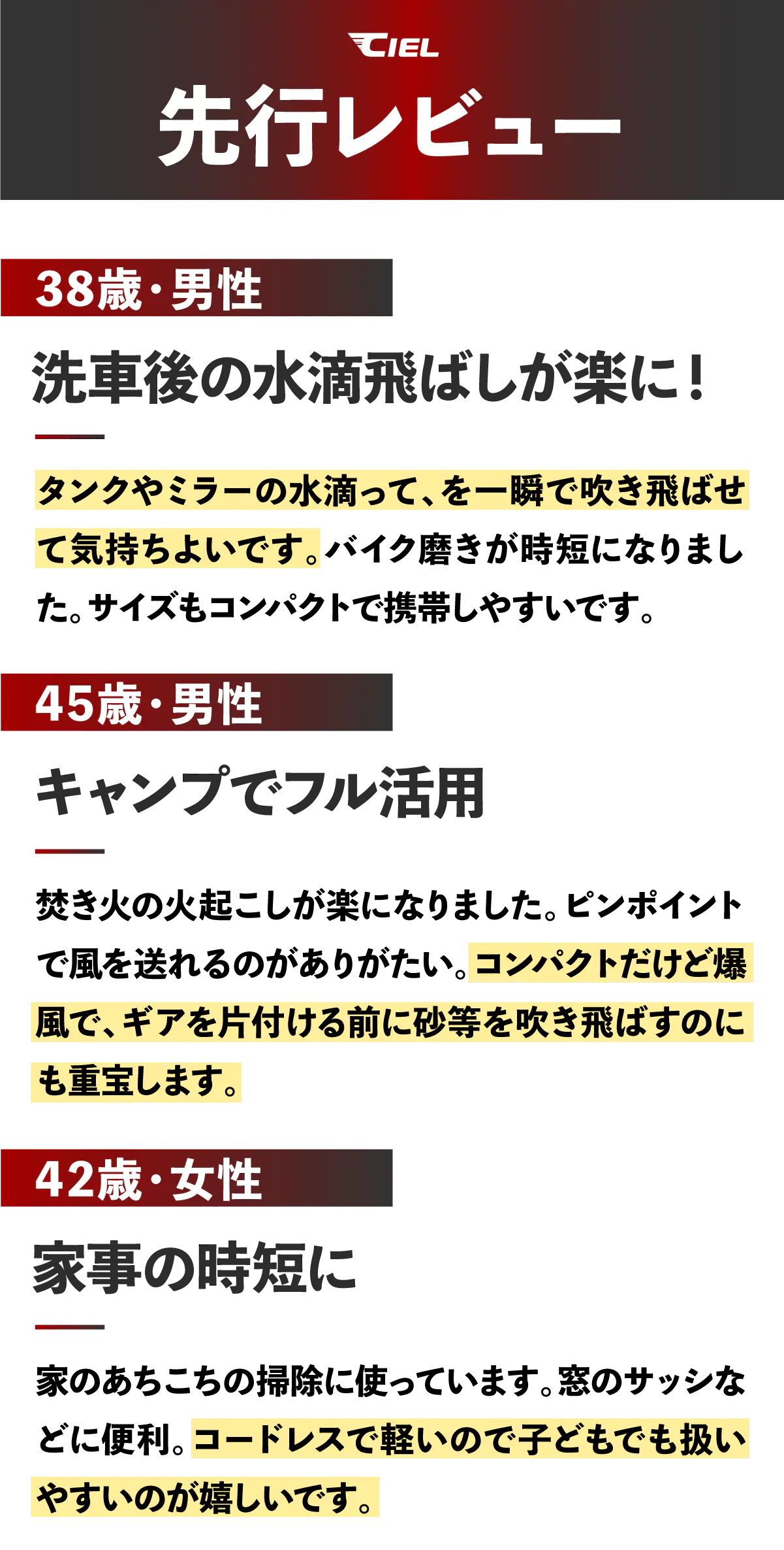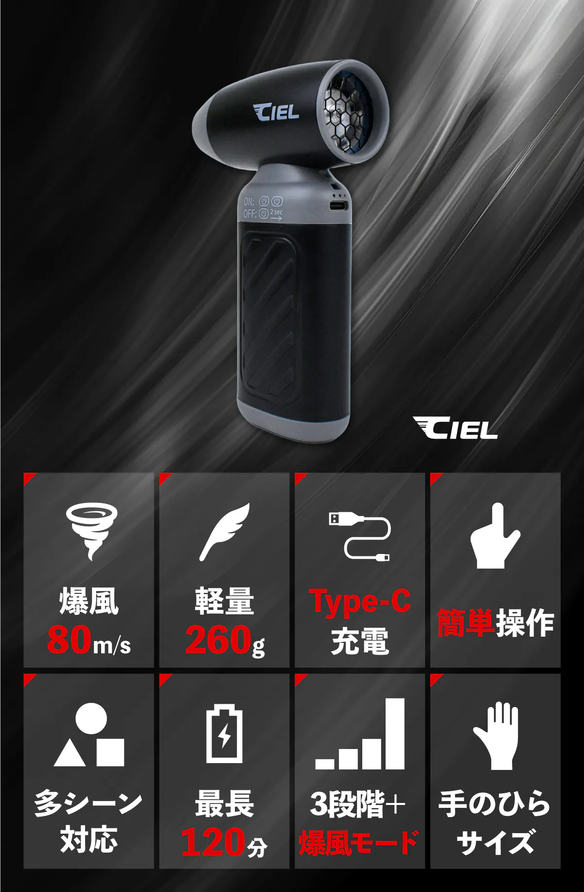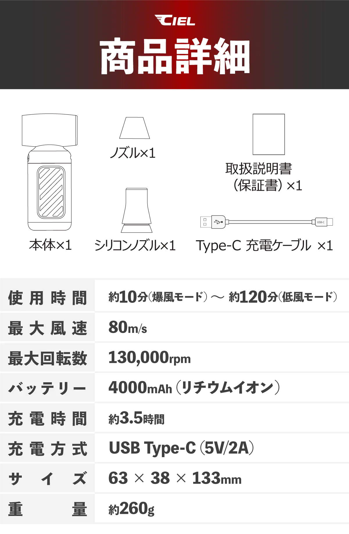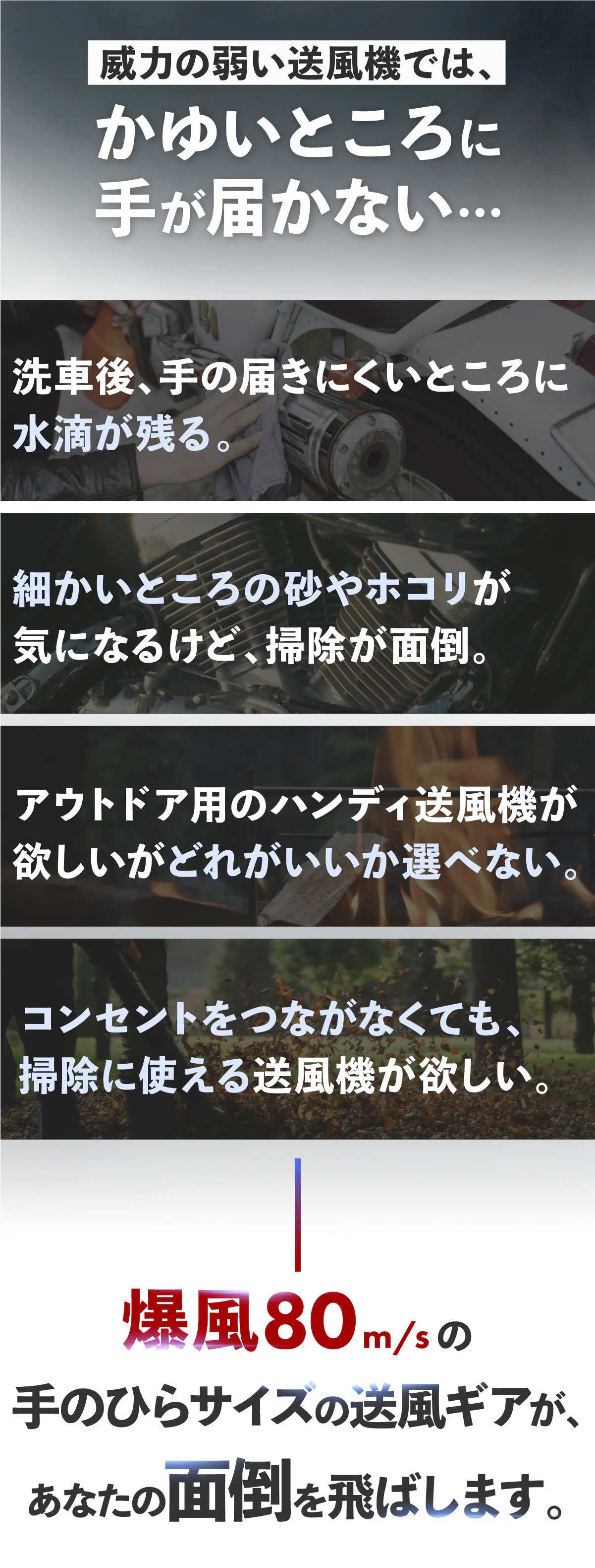 小型ながらも圧倒的な送風力で、あなたの作業を強力にサポート。清掃以外にもアウトドアやキャンプの火起こし、掃除にも使える、多用途に活躍する一台です。