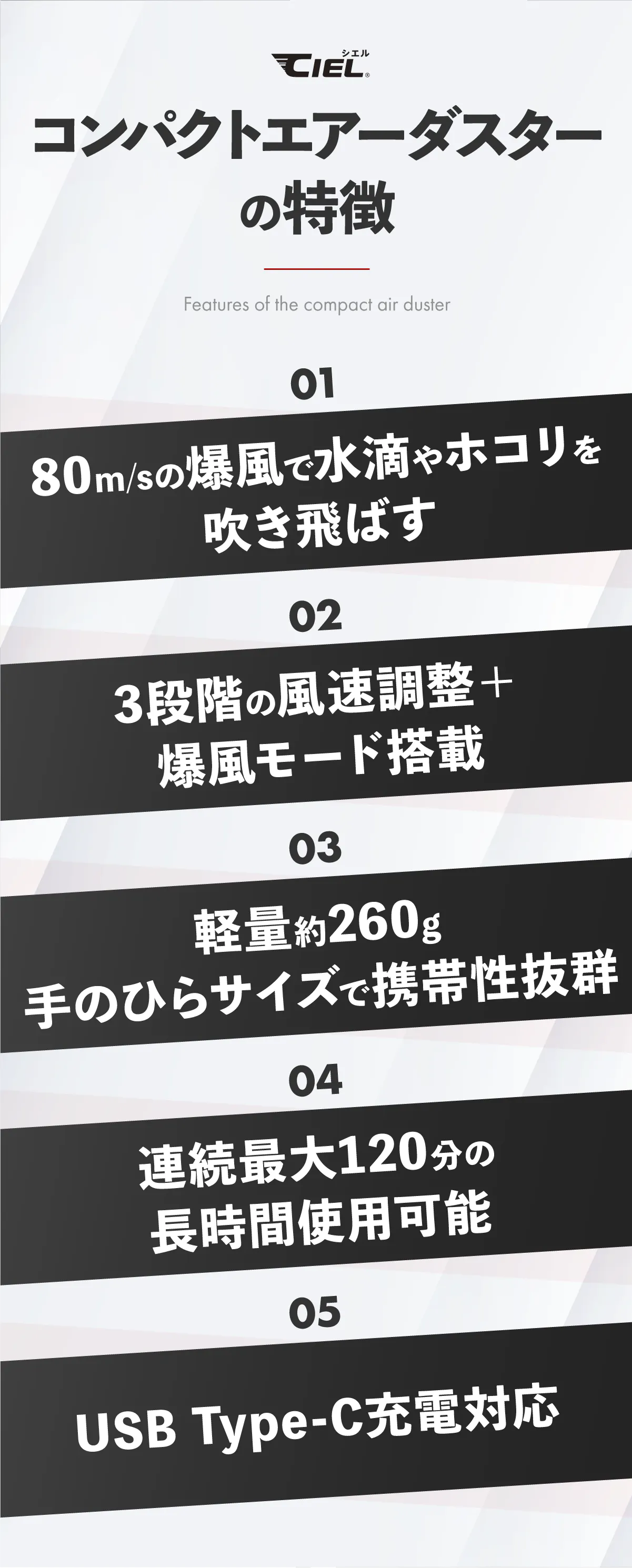 コンパクトエアーダスターは、4000mAhの大容量バッテリー。こまめな充電を気にせず、使いたいタイミングでしっかりパワーを発揮してくれます。