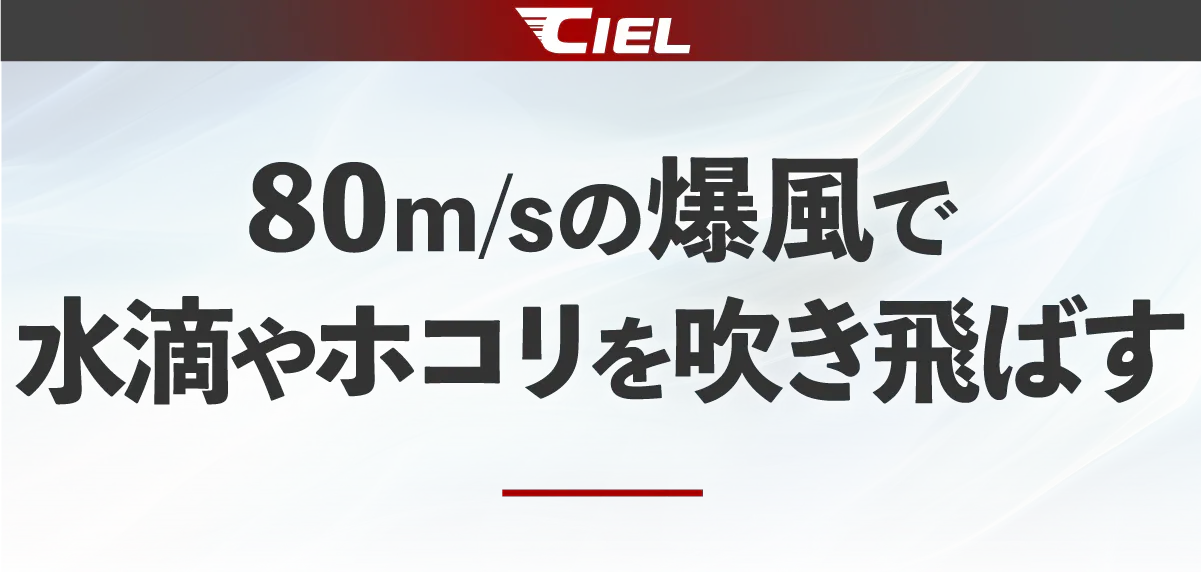 ジェット機の離陸速度にも匹敵する、最大風速80m/s(時速280㎞)の強力送風!この圧倒的なパワーにより、洗車後に車体に残った細かい水滴を素早く吹き飛ばし、拭き取りの手間を大幅に軽減します。
