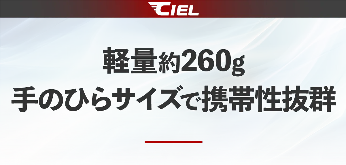 本体重量はわずか約260g。スマートフォンほどの軽さで、片手でラクに持てるコンパクトサイズです。手のひらに収まるほど小型なので、ポケットにもスッと収納可能。