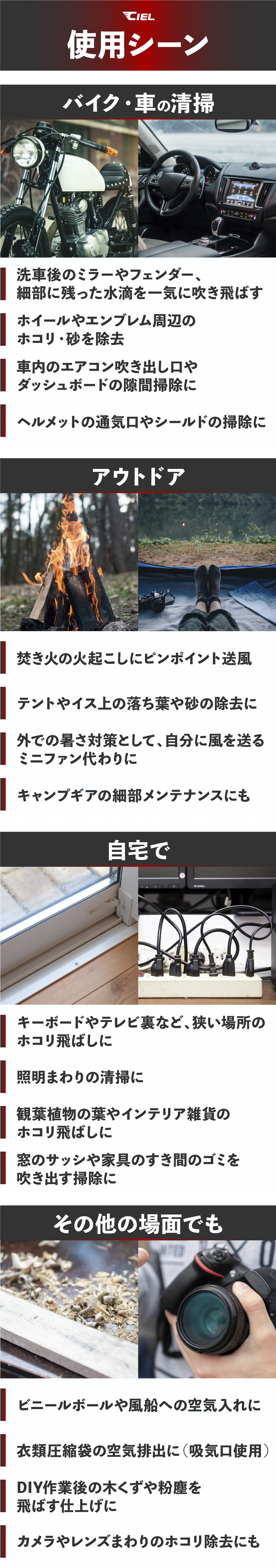 また、キーボードの隙間や車内のエアコン吹き出し、ヘルメットのベンチレーションなど、普段掃除しにくい狭い場所にたまったホコリも強力な風で一掃します。