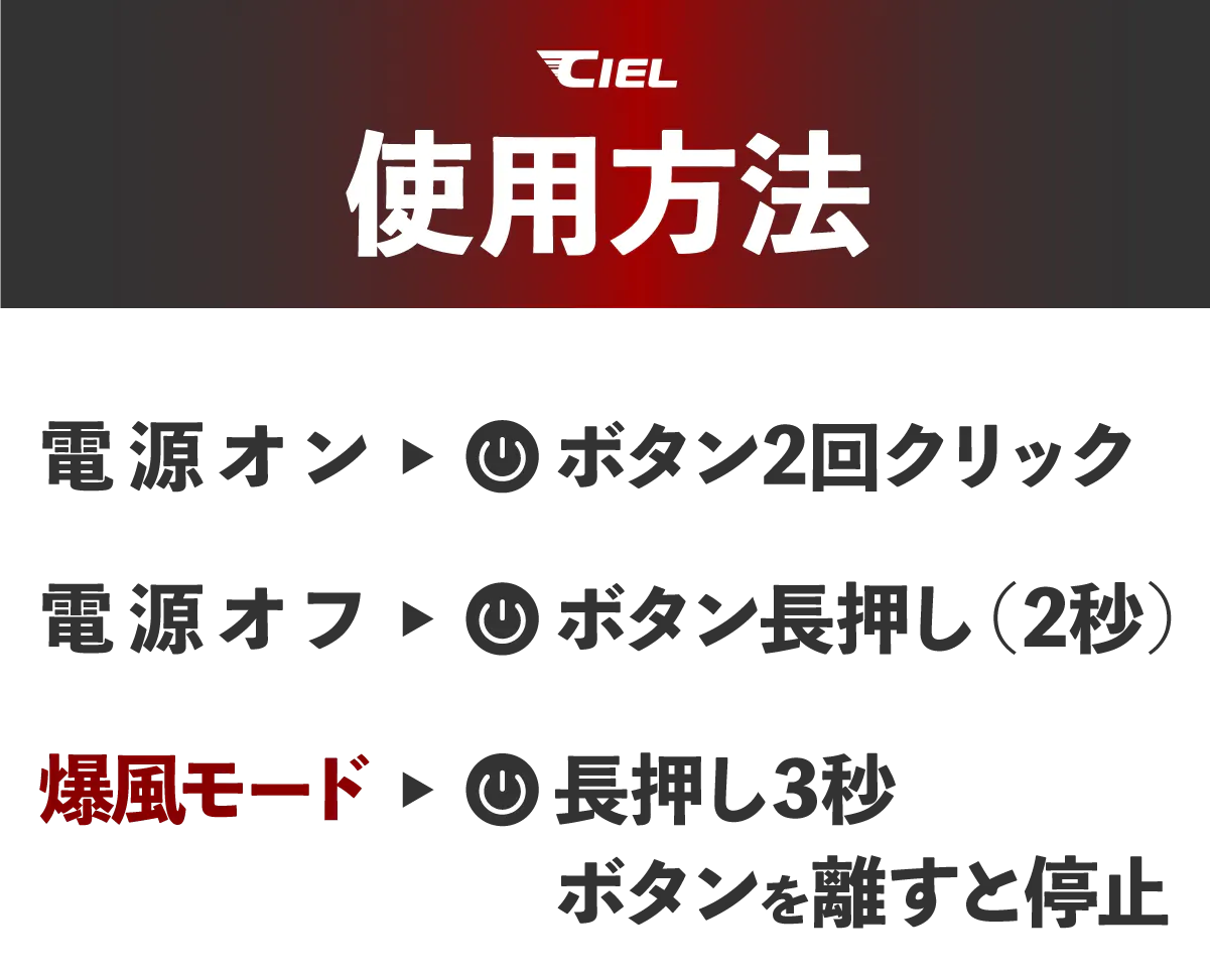 A 電源がオフの状態から、電源ボタンを約3秒押すと爆風モードになります。そのまま電源ボタンを押し続けている間は爆風モードです。電源ボタンから手を離すと、風が止まります。