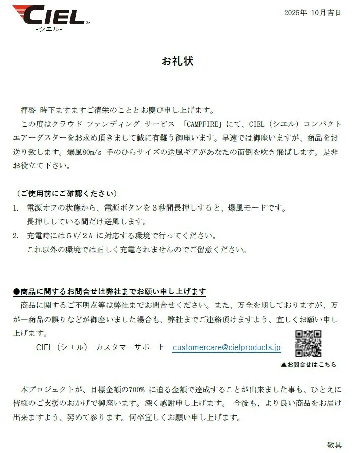 2025/10/29 14:48サポーターの皆様いつもお世話になっております。LINKSの森本でございます。おかげさまで、CIEL(シエル)エアーダスター プロジェクトを無事に終了することが出来ました。目標金額を700%間近に迫る金額で達成することが出来ました事も、皆様のご支援のおかげで御座います。深く感謝申し上げます。本当に有難う御座いました。商品発送につきまして、順次対応を進めて参ります。詳細につきましては、追ってご連絡とさせて頂きます。もうしばらく、お楽しみにお待ちください。何卒宜しくお願い申し上げます。株式会社LINKS担当 森本 もっと見る