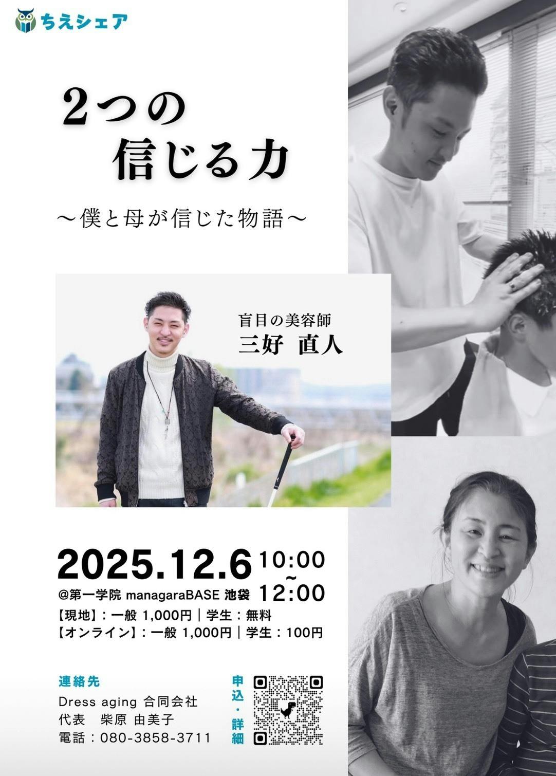 2025/12/05 10:00活動のご報告いつも私たちの活動に温かいご支援・応援を賜り、心より御礼申し上げます。この度、12月6日(土) 第一学院BASE池袋にて「ちえシェア」を開催いたします。☆ 9:30 受付開始☆ 10:00〜12:00今回のテーマは「2つの信じる力」登壇者は、盲目の美容師 三好直人さん。視力を失うという大きな困難を抱えながらも、夢を諦めず歩み続ける中で、彼を支えた“2つの信じる力”とは――この2つの信じる力は、彼の人生にどんな奇蹟を起こしたのか。当日は、直人さんの生きる力とあたたかな物語を、ぜひ直接お受け取りください。 YouTubeライブ配信も行いますどこからでもご参加いただけます☆ お申込みはこちらPeatix イベントページ:https://chie-share-believe-in.peatix.com/公式LINE:https://lin.ee/Qu4Ztvf誰かの人生が他の誰かの生きるヒントになる。我々は一人でも多くの方の人生を応援し、未来へつないでいきたいと考えています。皆様からの温かな応援に支えられています。今後ともよろしくお願い申し上げます。その “ちえ” いいかも! ちえシェア‼――Dress aging合同会社代表 柴原由美子 もっと見る