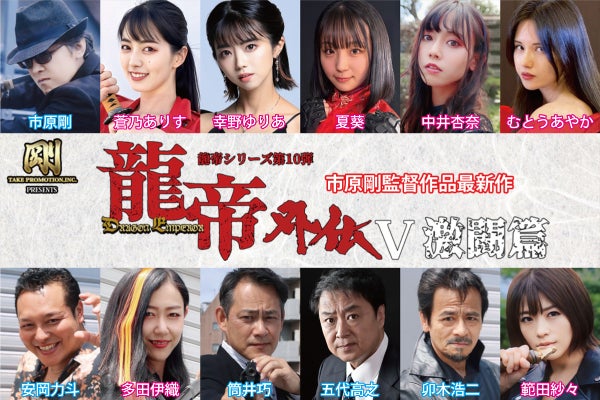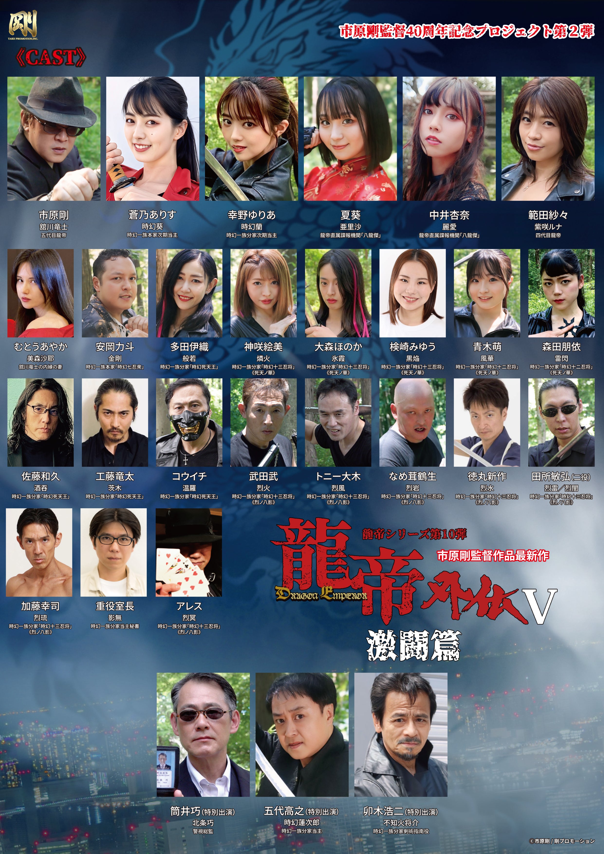 主人公・五代目龍帝こと舘川竜士を演じるのは、原作・製作総指揮・脚本・監督も務めるシリーズの顔・市原剛。四代目龍帝・紫咲ルナ役に範田紗々、時幻葵役に蒼乃ありす、その妹・蘭役に幸野ゆりあ。龍帝直属諜報機関「八龍傑」のメンバーとして、亜里沙役に夏葵、麗愛役に中井杏奈が出演。さらに、安岡力斗、多田伊織、神咲絵美、トニー大木、筒井巧ら市原組レギュラー陣が脇を固め、前作より続投となるJACレジェンド俳優・卯木浩二もゲスト出演。そして今作では、時幻一族分家の当主・時幻蓮次郎役に、『西部警察』兼子仁刑事役や『太陽戦隊サンバルカン』バルイーグル/飛羽高之役で知られる五代高之が特別出演。アクションと人間ドラマの極限に挑む、個性と実力が火花を散らす豪華俳優陣の競演がついに実現した!!