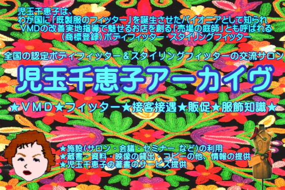 「児玉千惠子アーカイヴ」(広島県府中市)は、長きに渡ってアパレル業界や地域活性化に携わってきた、児玉千恵子の足跡をたどり、その著作や映像、関連資料(VMD・販促・フィッター・接客接遇 他)を編集し、それらの閲覧や提供を一般に公開し、皆さまのサロンとしても活用していただくことを目ざすものです。