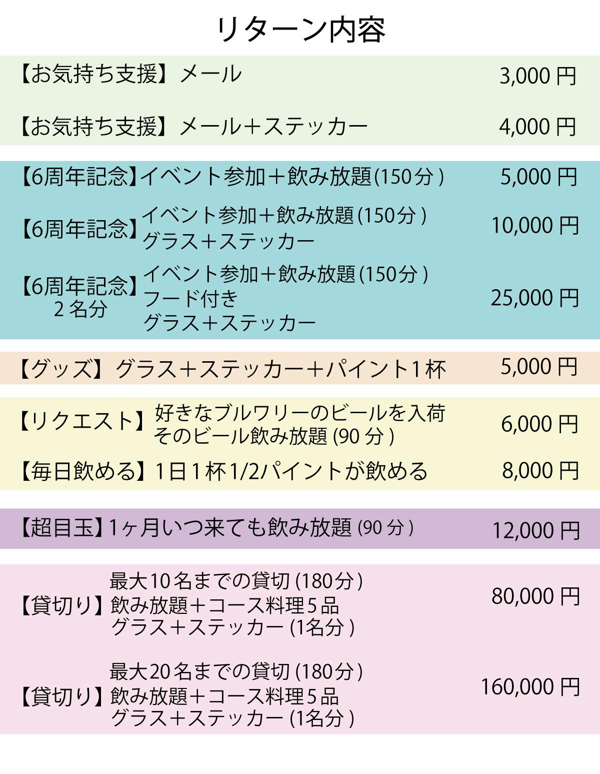①6,000円・・・【リターン】11月中に6周年記念イベントに参加できる、クラフトビール飲み放題(150分)