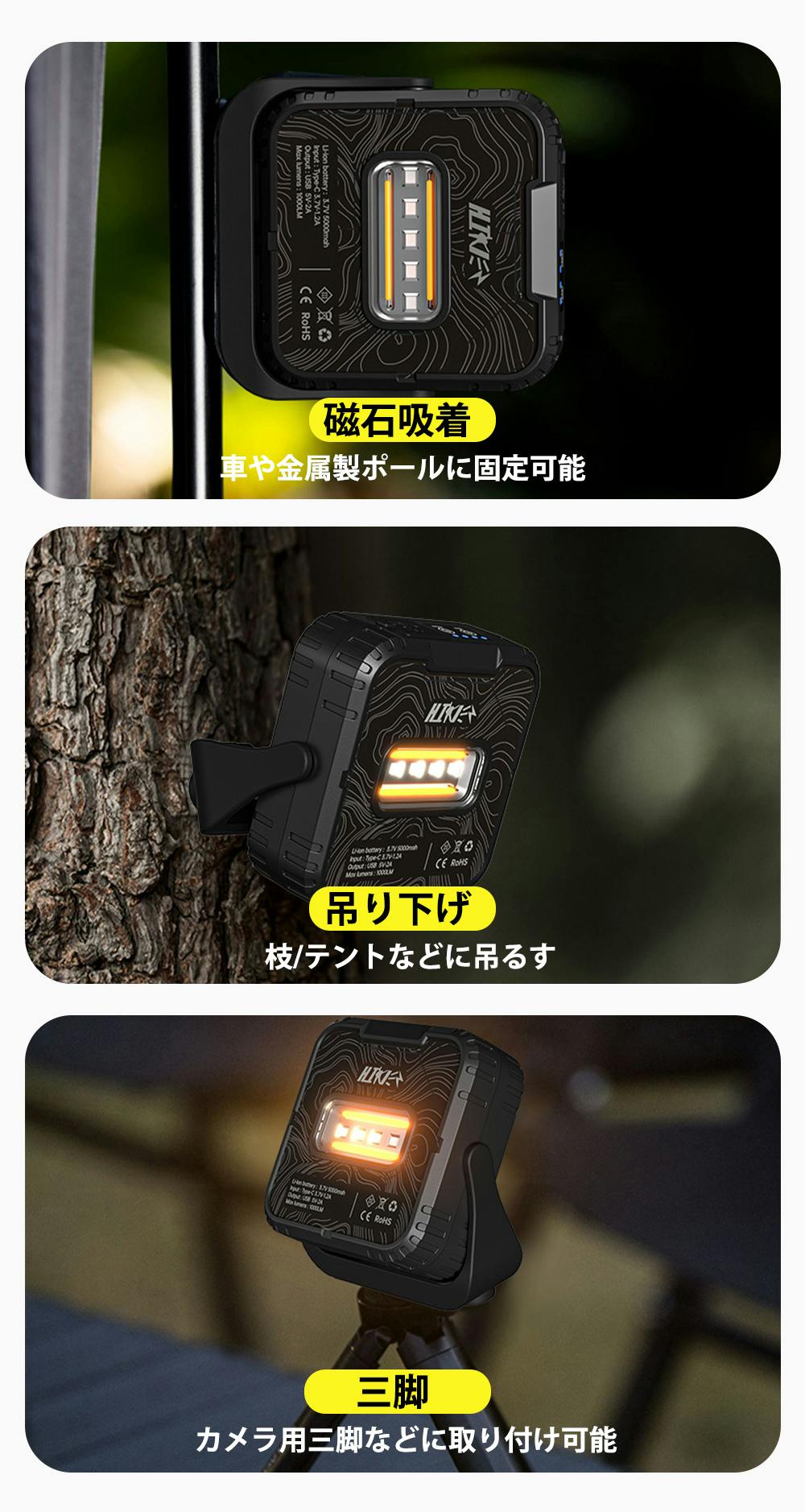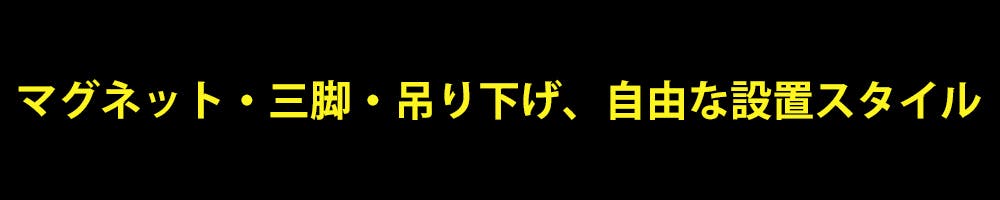 強力マグネットでピタッと貼り付けたり、三脚やフックに引っ掛けたりと、使い方自由自在。キャンプや停電時など、さまざまなシーンで頼れる存在です。