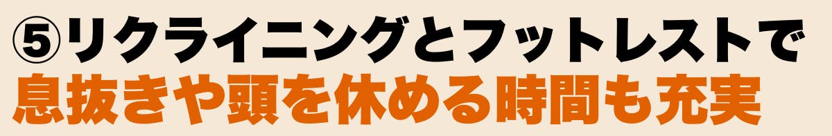 135度のリクライニングと+座面下から引っ張り出せるタフなフットレストは、