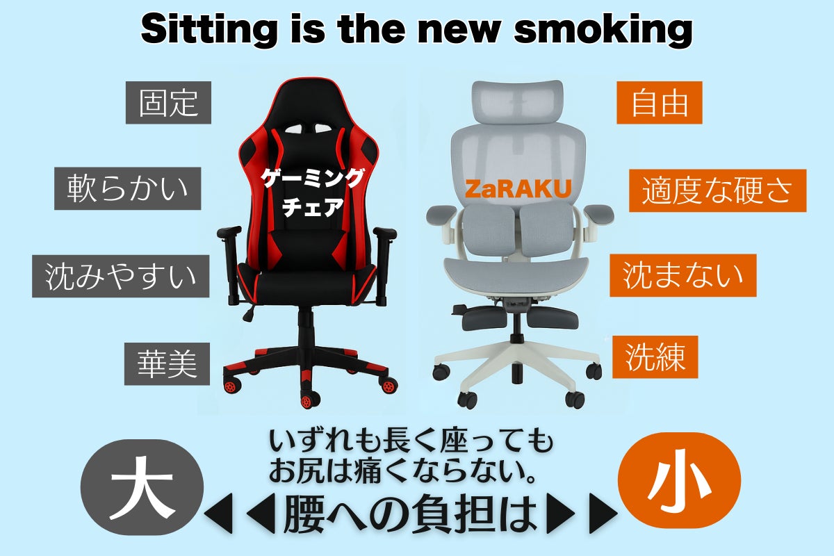 A:はい。実際に10万円以上のチェアと同等のエルゴノミクス構造を備えており、そのうえ、ZaRAKUは「あぐらがかける自由さ」と「人間工学機能が揃っている」を両立させた、なさそうである次世代のワーキングチェアです。