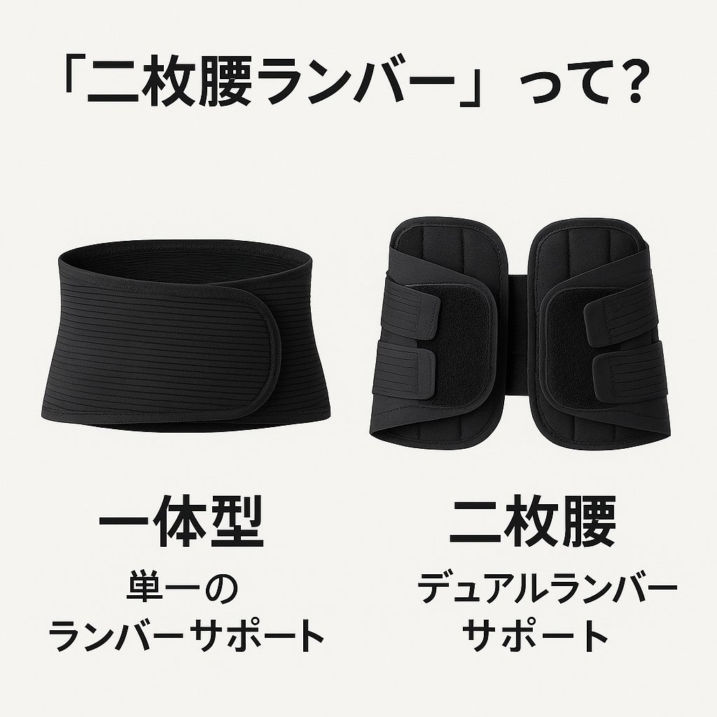 画像をご覧ください。左が一体型サポーター、右が左右調整型(二枚腰)です。