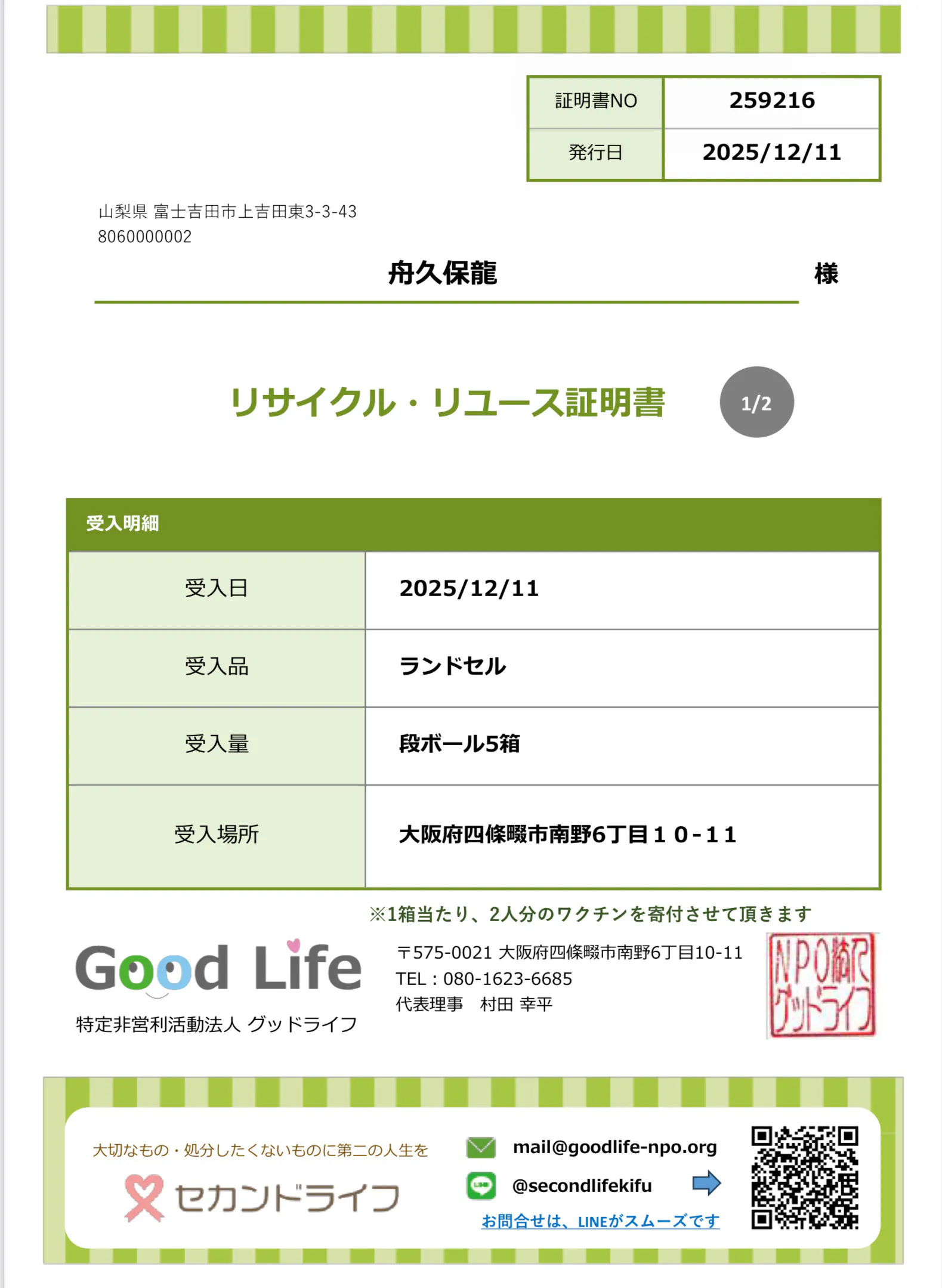 代わりに、回収したランドセル数・発送実績・証明書なども合わせてご報告します。