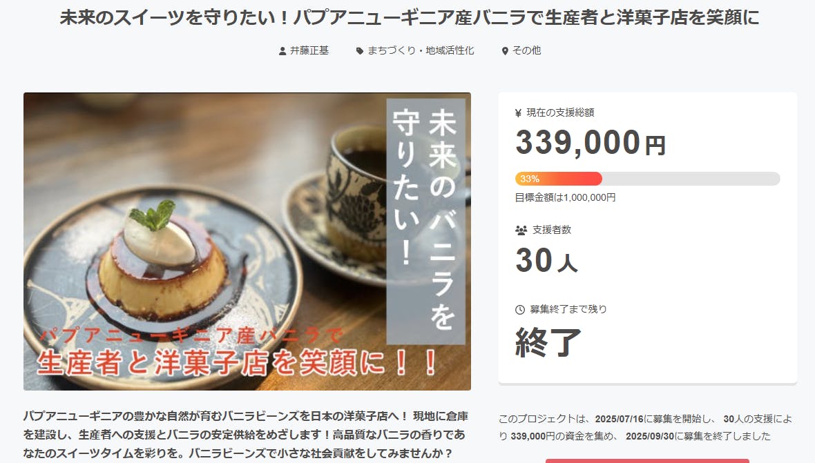 妻の実家があるパプアニューギニアの農家から頼まれ、2020年からバニラビーンズを販売しているPapuVani(ぱぷばに)の井藤です。この度、日本中のスイーツに欠かせない、あの芳醇な香りを守りたいという想いから、クラウドファンディングに挑戦します。