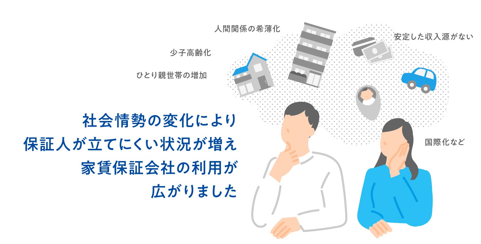「部屋を借りたいけど連帯保証人を頼みにくい。」「頼める人が身近にいない。」など、入居を希望する方がお部屋を探す際にこのようなお悩みがある一方で、オーナー様にとってお部屋は大切な資産であるため、連帯保証人を条件にするなど、より安心して貸したいという思いがあります。