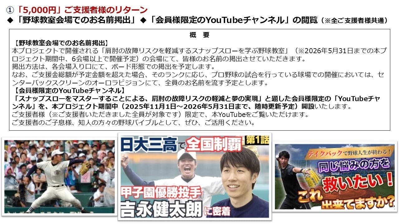 ◆2026年5月31日、リターン終了(本機の提供、大口ご支援者冠の野球教室の開催)